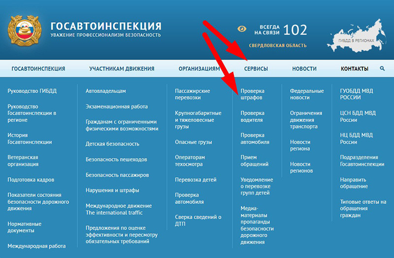 1. На главной странице сайта выберите раздел «Сервис», а затем перейдите во вкладку «Проверка штрафов».