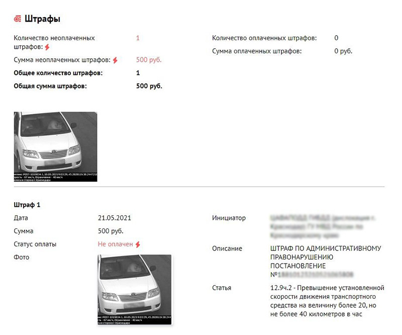 Штраф один – на 500 рублей, выписан за превышение скорости. Тут же указан инициатор, статья, дата, в которую владелец нарушил ПДД, и номер постановления.