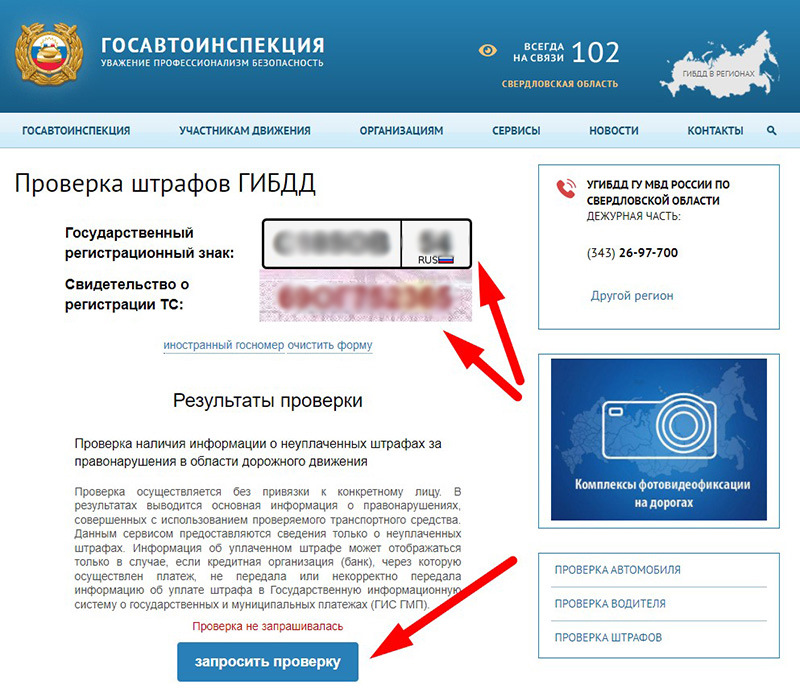 2. Введите госномер и номер свидетельства о регистрации машины и запросите проверку.