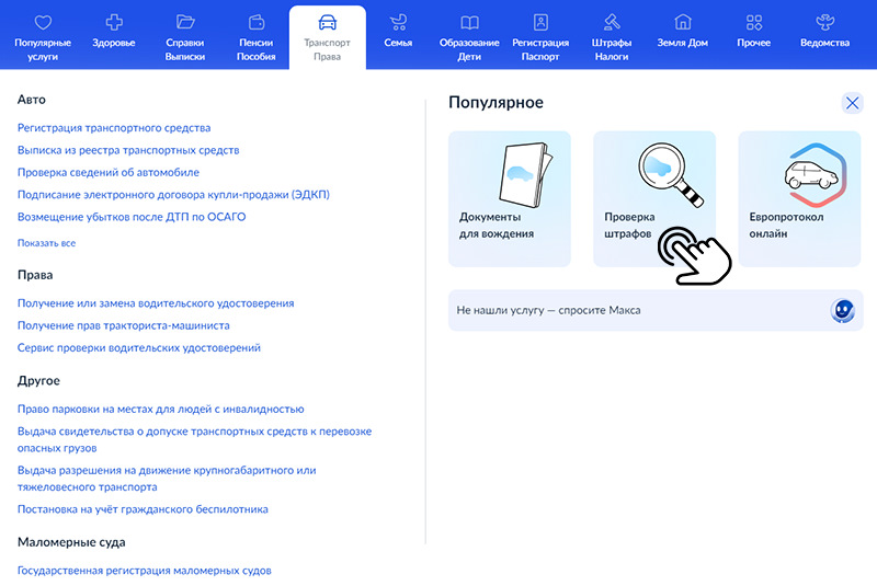 1. Зайти в раздел «Услуги», а затем во вкладку «Транспорт / Права» и выбрать команду «Проверка штрафов».