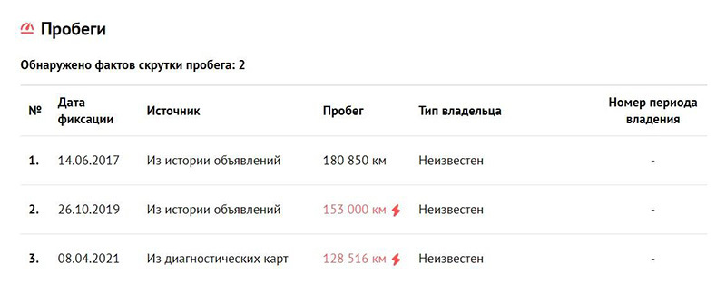 В истории пробегов имеется всего три записи, причем две первых взяты из истории объявлений и только одна, третья, – из диагностической карты. Вероятно, машину не обслуживали должным образом.