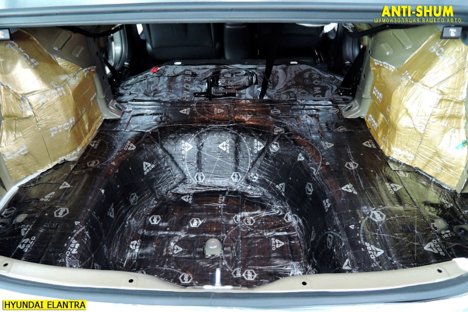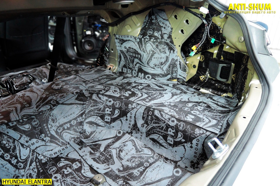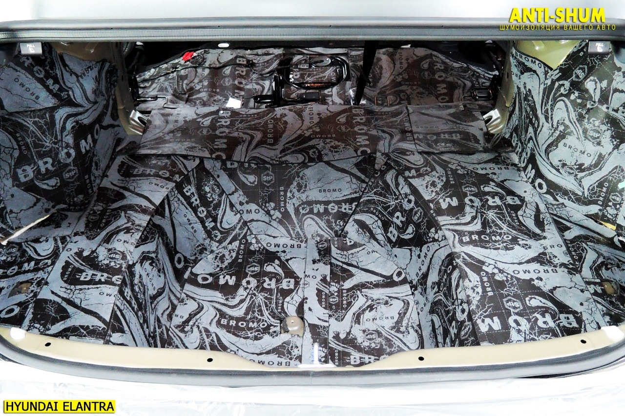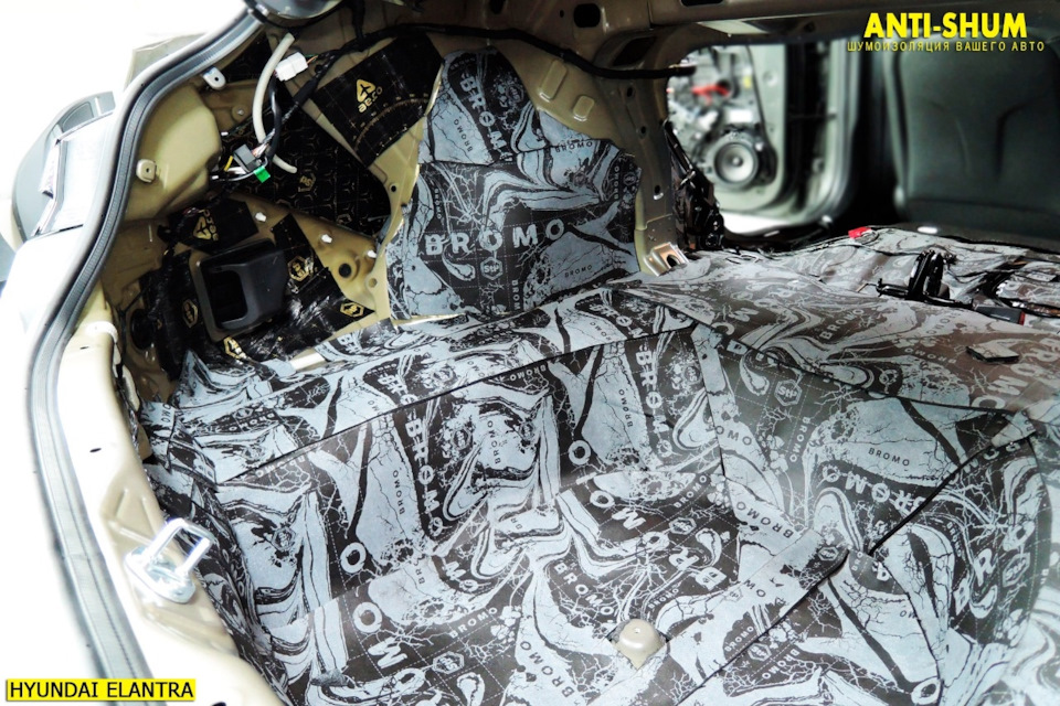 Второй слой в багажнике, наш любимый материал СТП Bromo! При толщине 7 мм работает также как 15-20 миллиметровые аналоги, при этом сборка салона без проблем! Рекомендуем!