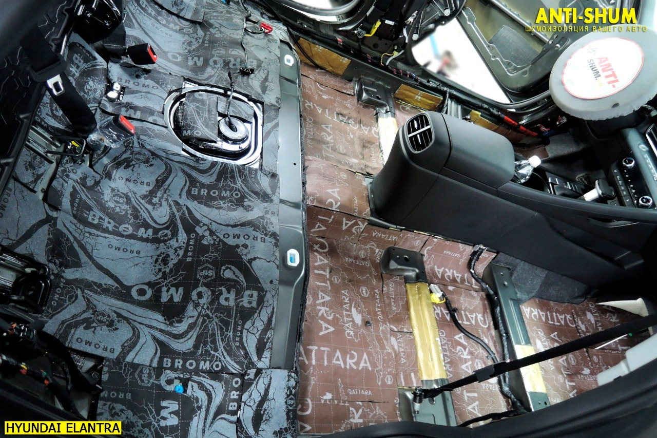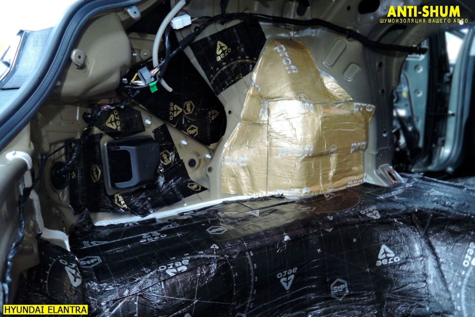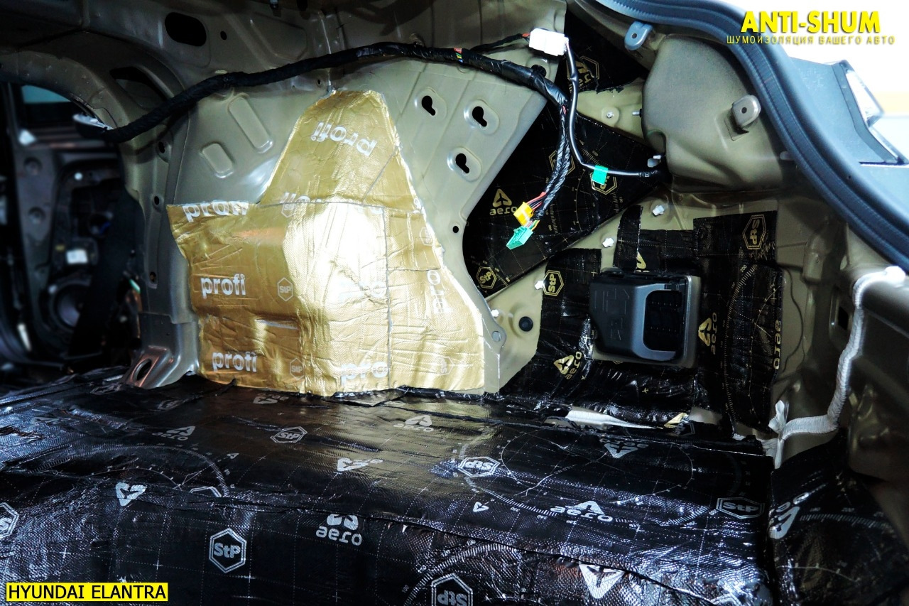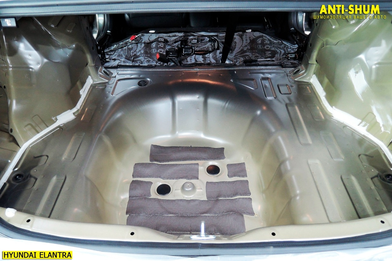 Второй слой в багажнике, наш любимый материал СТП Bromo! При толщине 7 мм работает также как 15-20 миллиметровые аналоги, при этом сборка салона без проблем! Рекомендуем!