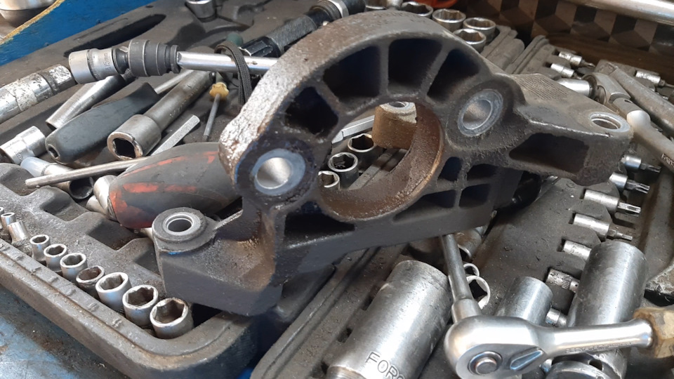 Далее нам надо снять кронштейн раздаточной коробки. С одним из болтов его крепления приходится изрядно повозиться.