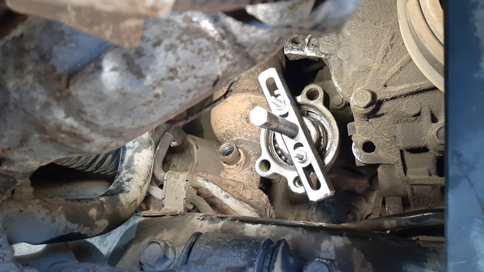 Постараемся выпрессовать подшипник, не разбирая корпус раздатки. Это непростая задача – посадочные места подшипника на валу и в корпусе покрылись слоем ржавчины.