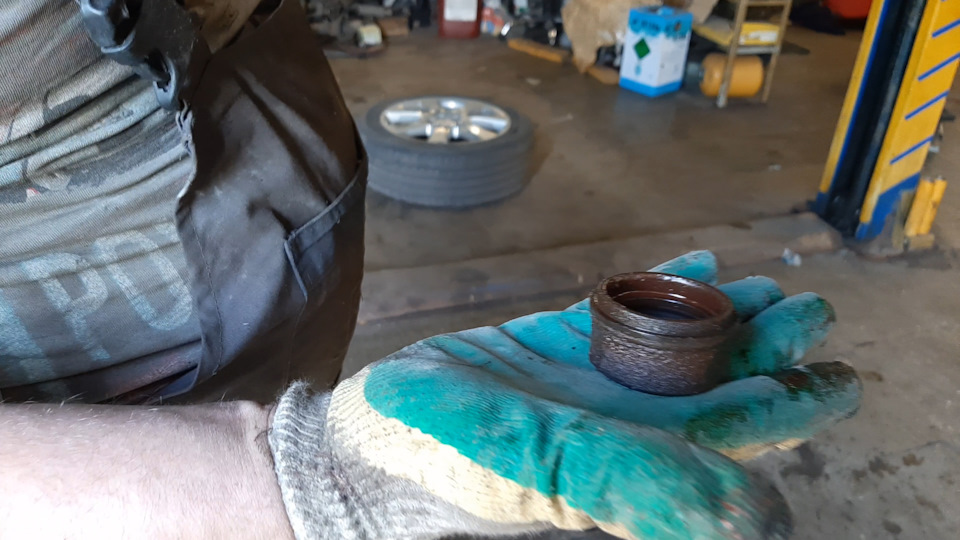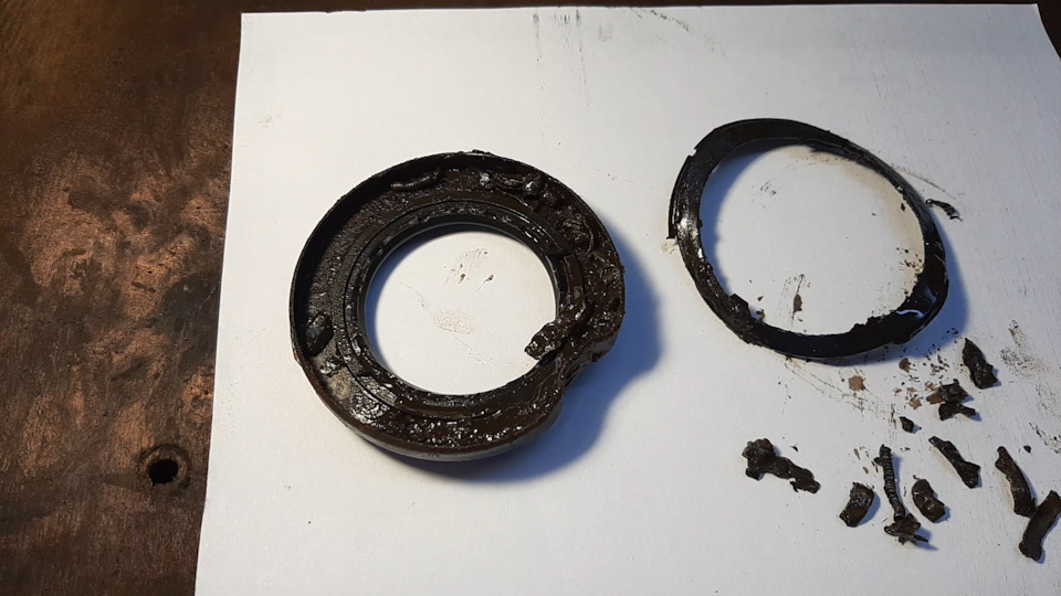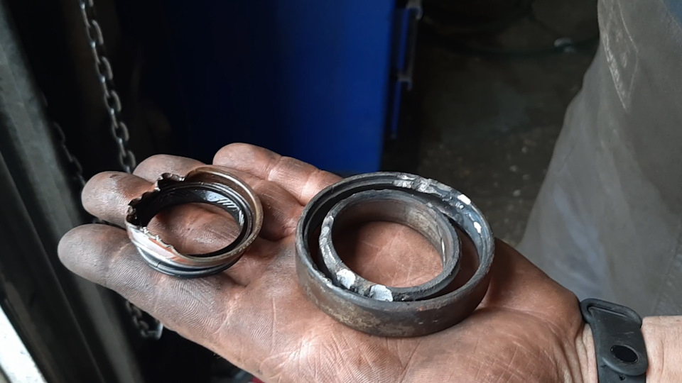 Ну вот все трудности позади. Это сальник выходного вала раздатки, который стоял за подшипником. А это сам подшипник, вернее то, что от него осталось.