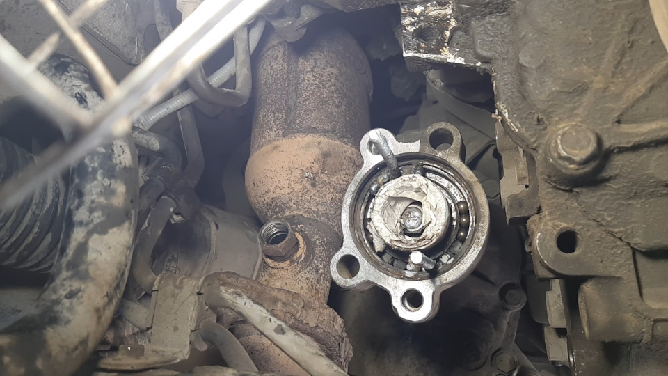 Извлекаем пыльник, а за ним открывается картина бедствия – вылетевшая защитная шайба и перемолотые куски сепаратора подшипника выходного вала раздатки. Вот к чему привело постоянное попадание влаги и песка.