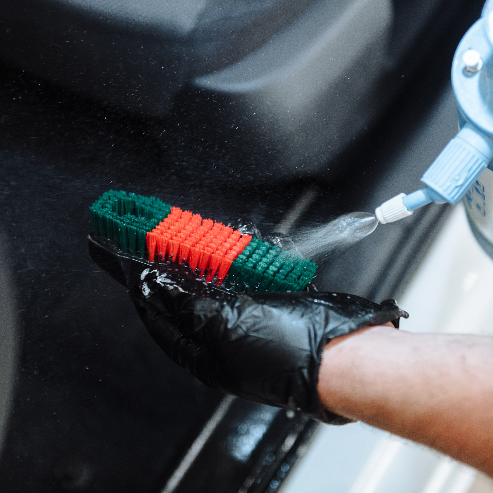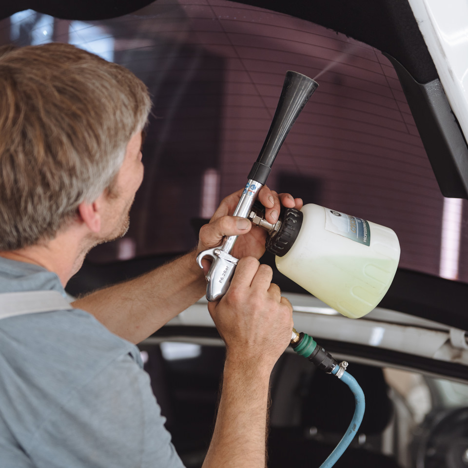 2. Сухая химчистка салона. Происходит распыление чистящего средства или нанесение пенных составов на грязные поверхности. Остатки шампуни убираются с помощью автомобильного пылесоса или салфетки.
