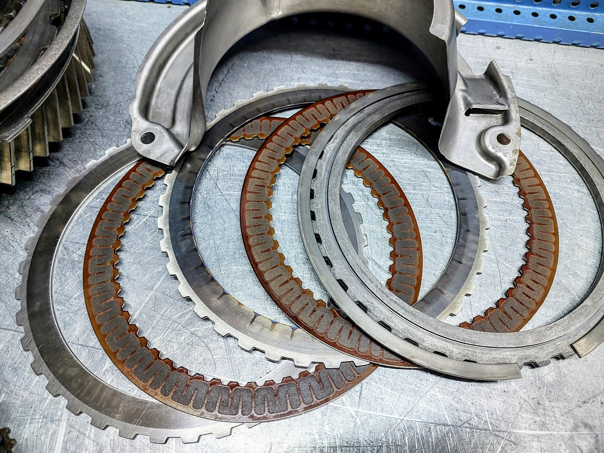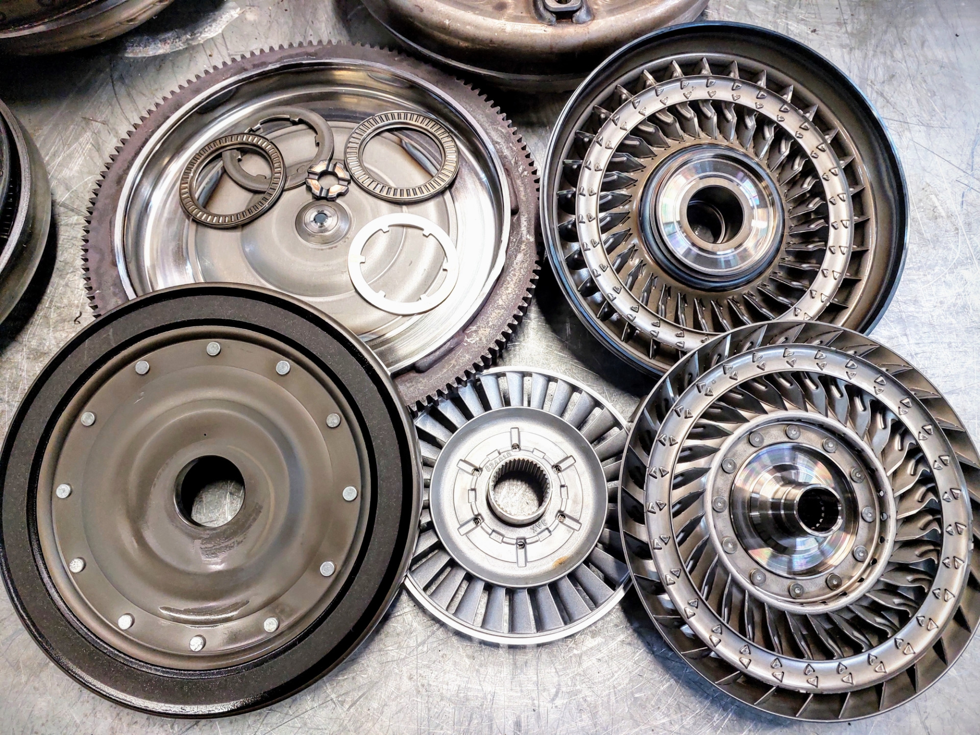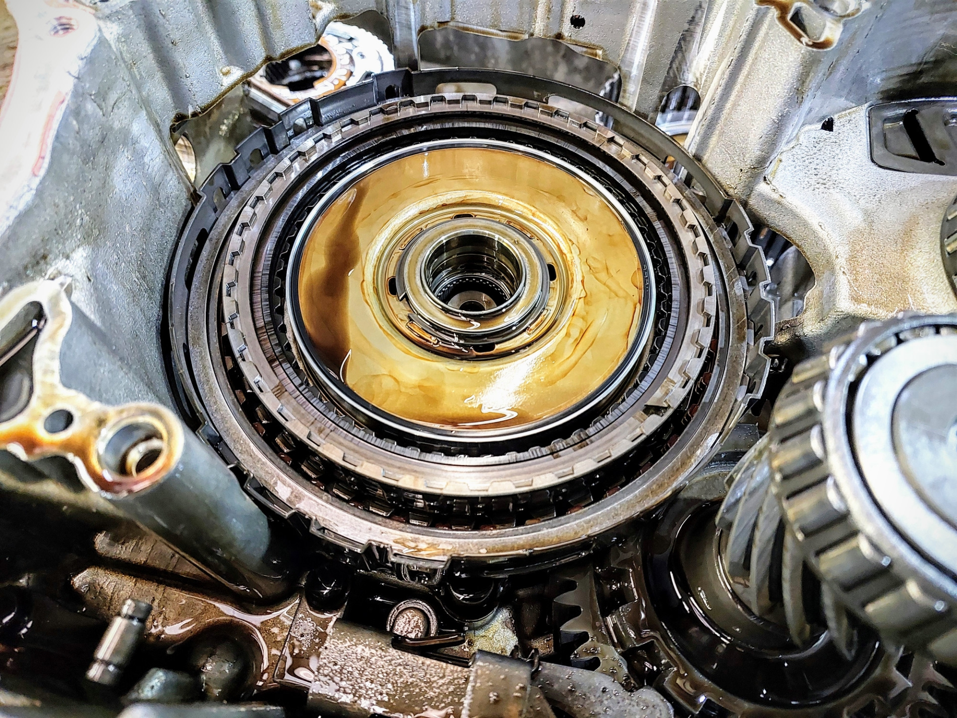 Дефектовка трансмиссии выявила присутствие металлической стружки, сгоревшие пакеты фрикционных дисков, стальных дисков, повреждение масляного насоса, износ поршней, тефлоновых колец, прокладок и сальников. Гидроблок был сильно загрязнён. В гидротрансформаторе сгорела фрикционная накладка, износился тефлоновый уплотнитель ступицы турбины. Обязательно предложили установить дополнительный радиатор вместо штатного теплообменника. Согласовали стоимость ремонта с клиентом, приступили к восстановительным работам.