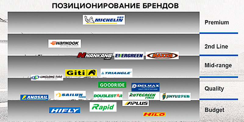 В стране тоже образовалось своё позиционирование шинных марок. Как и положено, есть там и премиальные бренды, и качество среднего диапазона, и огромная (основная) масса бюджетных марок. Правда, с единственной для всех европейцев оговоркой: премиум-класс китайских шин, конечно, не то же самое в отношении маститых марок из Европы, Америки или Японии. Речь здесь может идти о сравнении лучших марок из КНР со средним сегментом, принятым во всём мире.