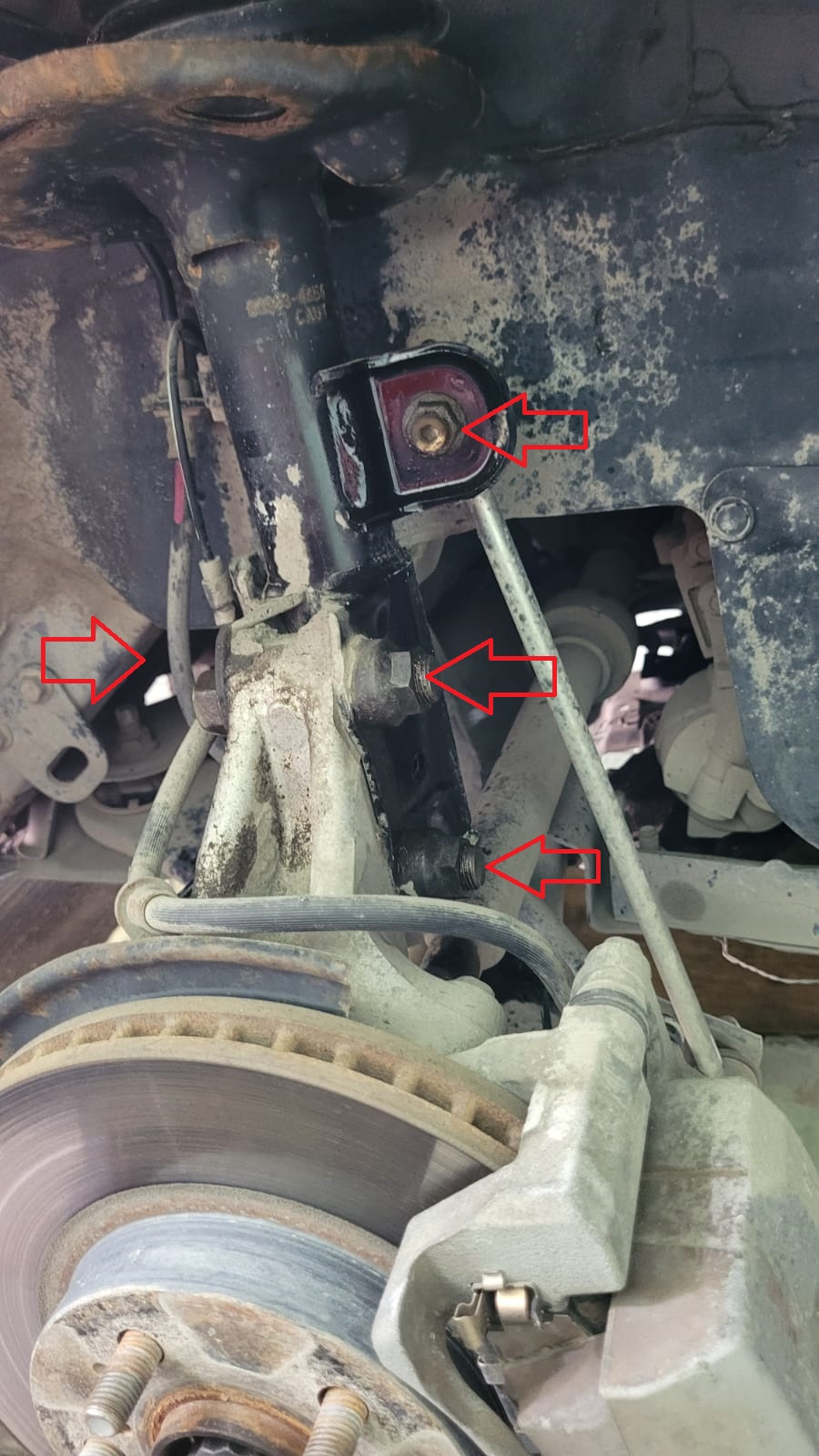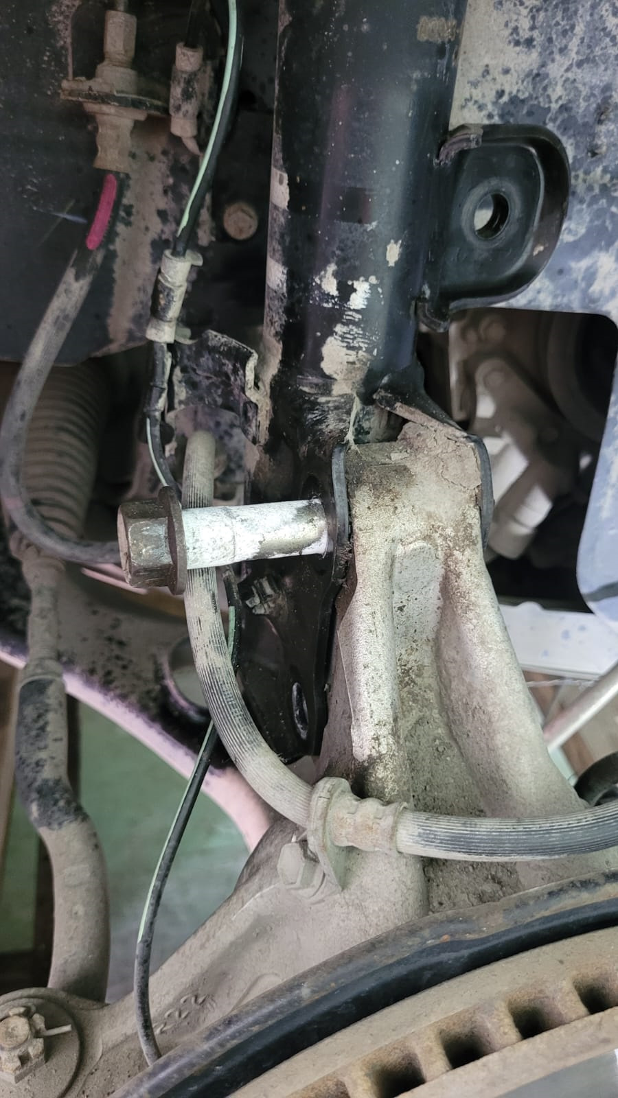 Откручиваем 2 болта крепления стойки амортизатора к ступице, верхнее крепление стойки стабилизатора и крепление датчика АБС