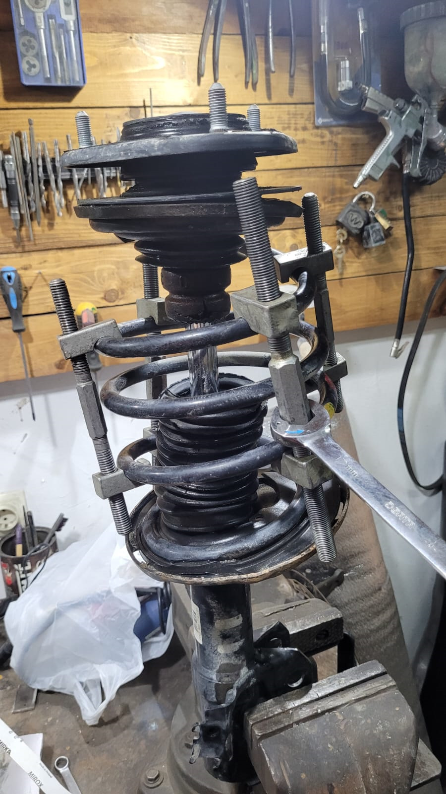 Сняв стойку амортизатора с автомобиля стягиваем пружину что бы выбить штатные шпильки