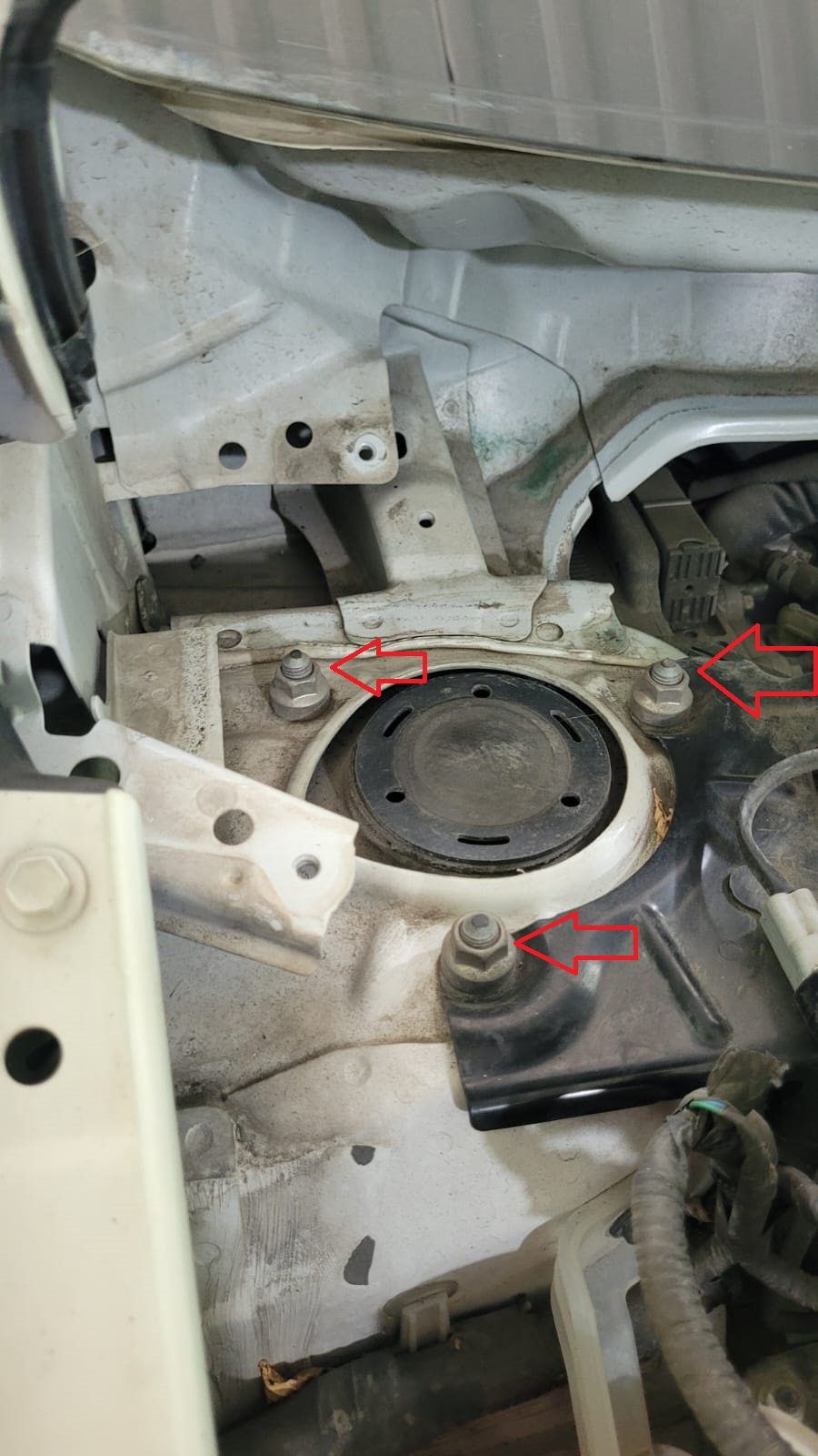 Получив доступ к опоре откручиваем 3 гайки крепления опоры к кузову