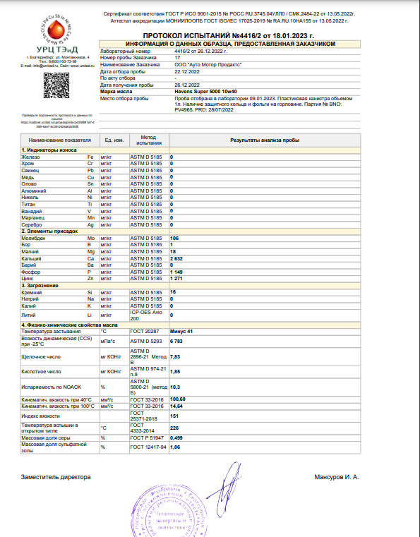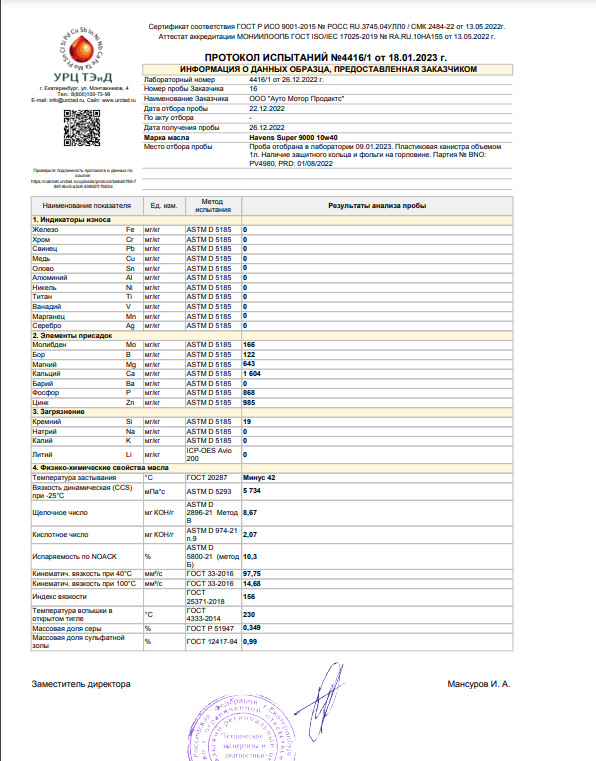 Масло гарантирует максимальную чистоту, снижение затрат на техническое обслуживание двигателя, превосходную термоокислительную стабильность, высокие защитные свойства, что подтверждается протоколами испытаний.