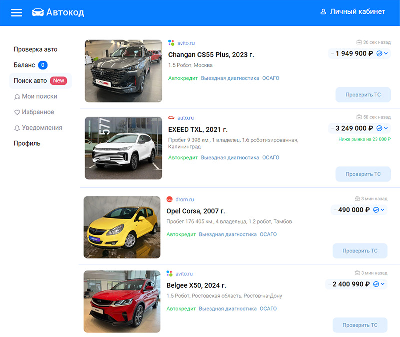 Здесь вы сможете просматривать объявления сразу со всех досок, а также заказывать проверку автомобиля, которая покажет угон, залог, запреты на регистрацию, долги по штрафам ГИБДД, наличие страховки ОСАГО, использование в такси, скрутку пробега. Посмотреть пример отчета сможете по ссылке.