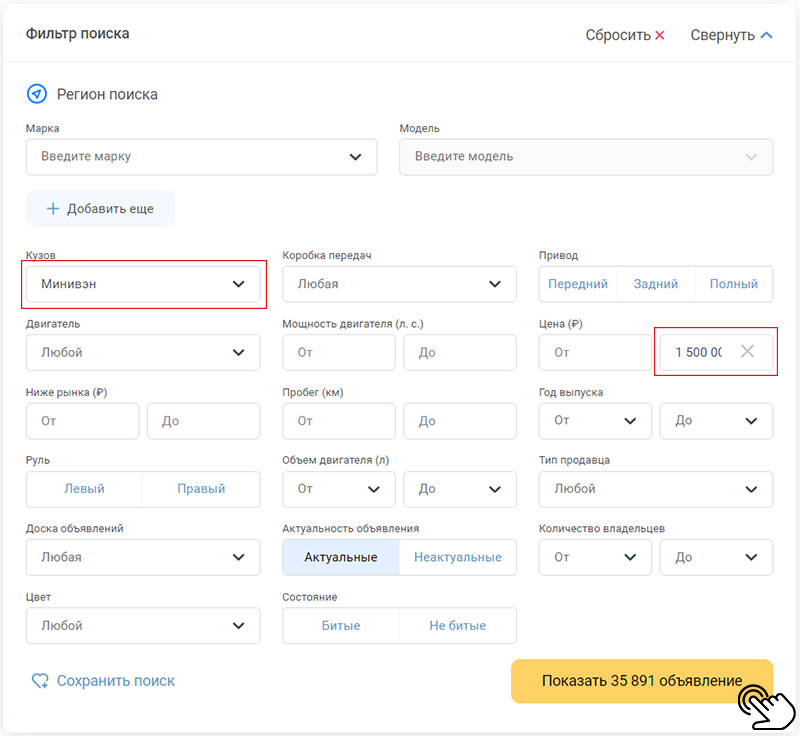 • Установите остальные критерии – например, цена не должна превышать 1,5 млн рублей.