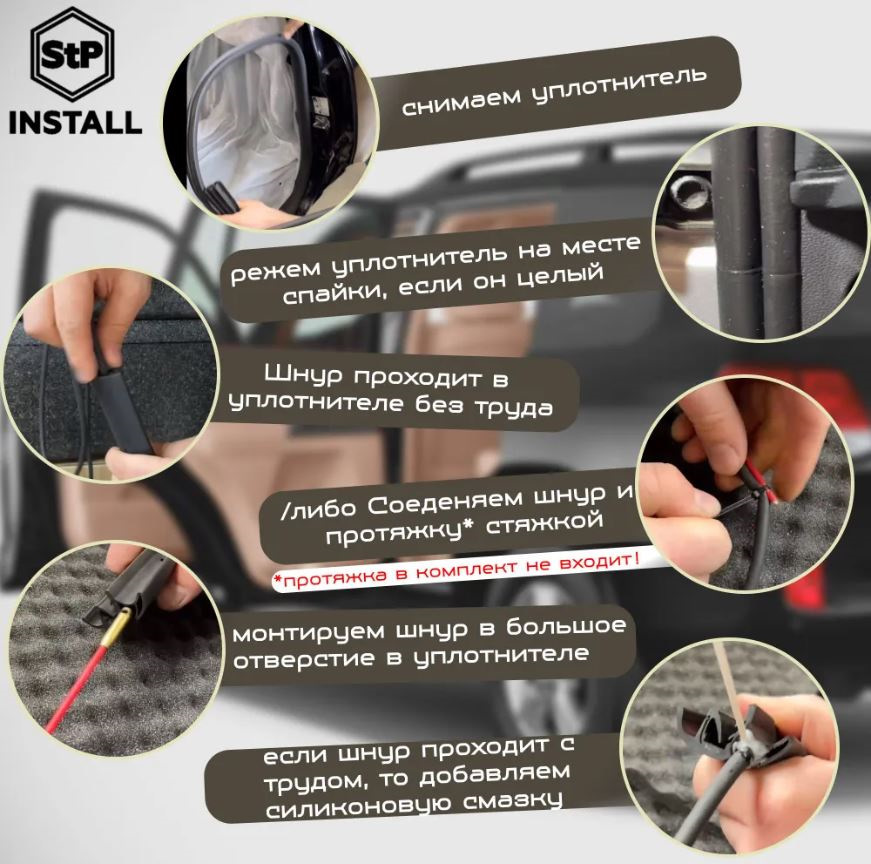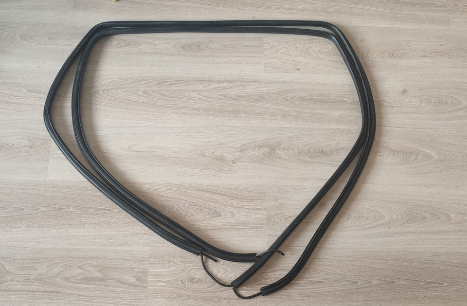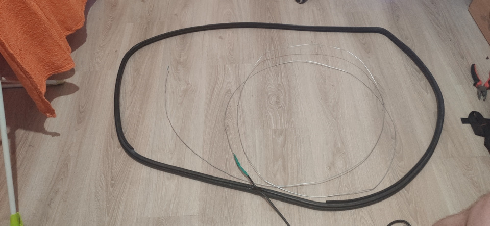 Сзади процесс особо не отличается нет разве что уплотнитель уже не цельное, а разомкнутое кольцо — под порогом "не хватает" кусочка в несколько сантиметров. Принципиально это ни на что не влияет, но протягивать материал становится легче — можно почти по прямой разложить и тянуть кондуктор.