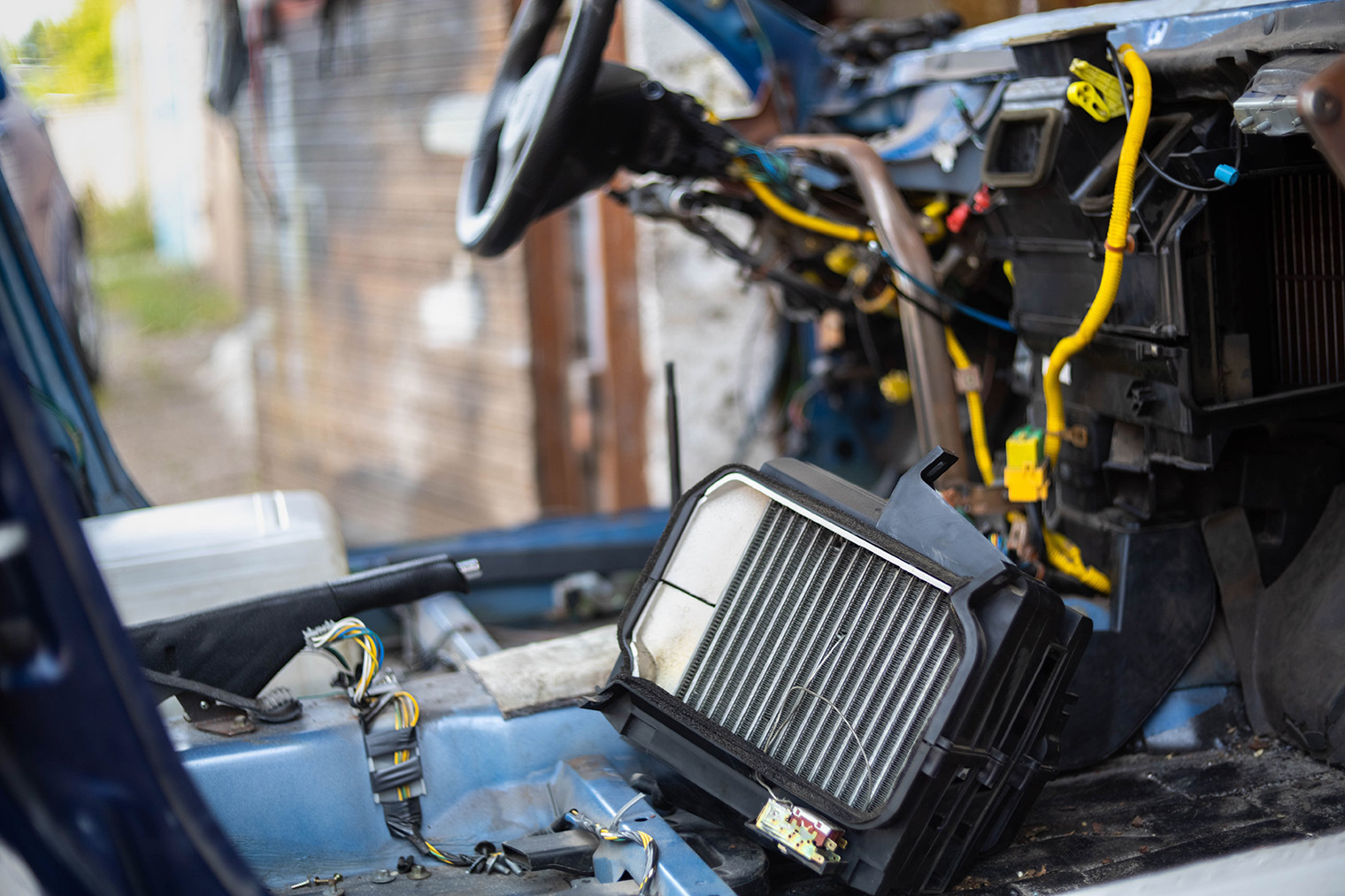 Конструкция печки салона включает в себя радиатор, патрубки для циркуляции охлаждающей жидкости, регулятор потока жидкости, воздуховоды, заслонки и вентилятор.