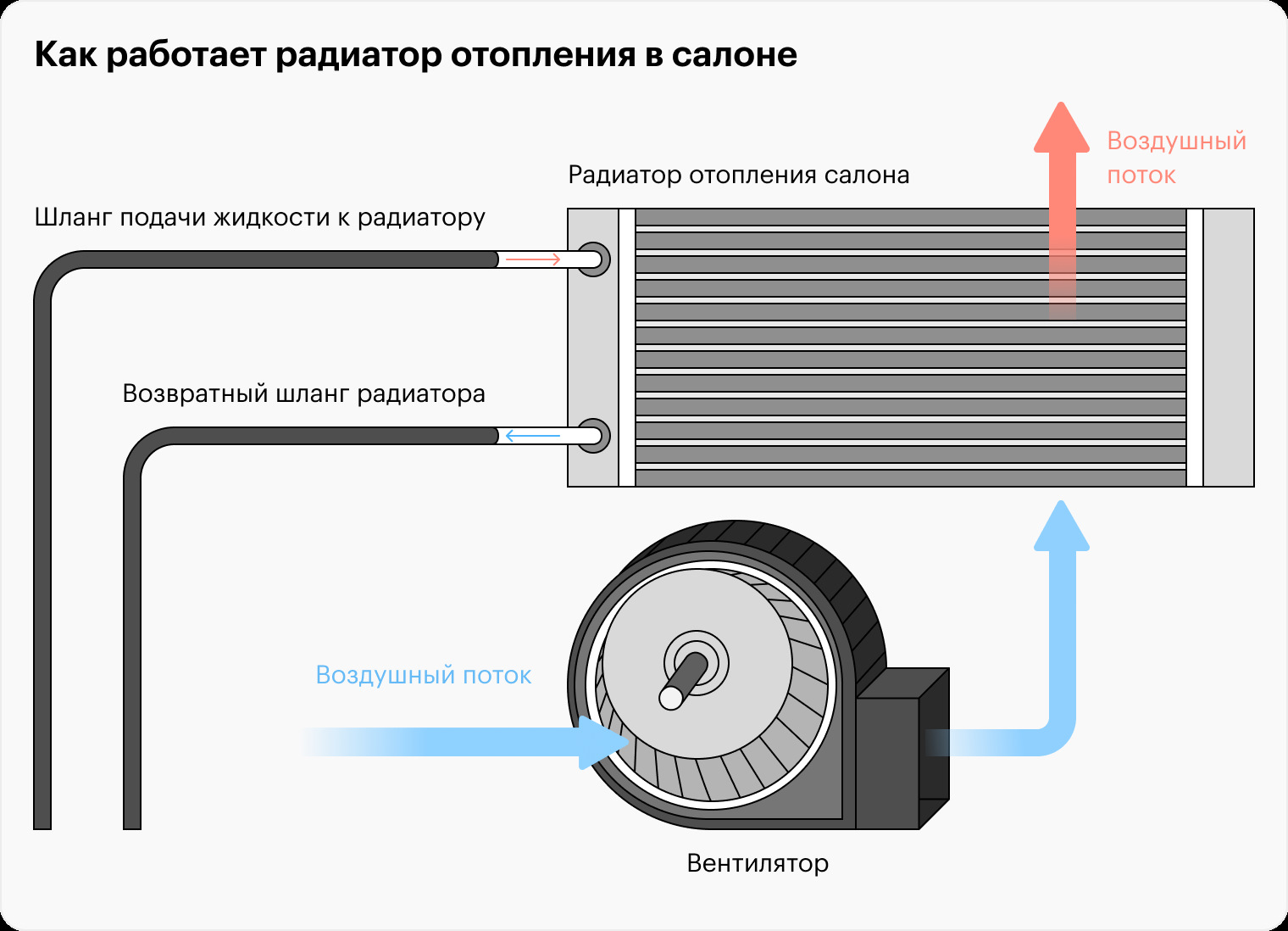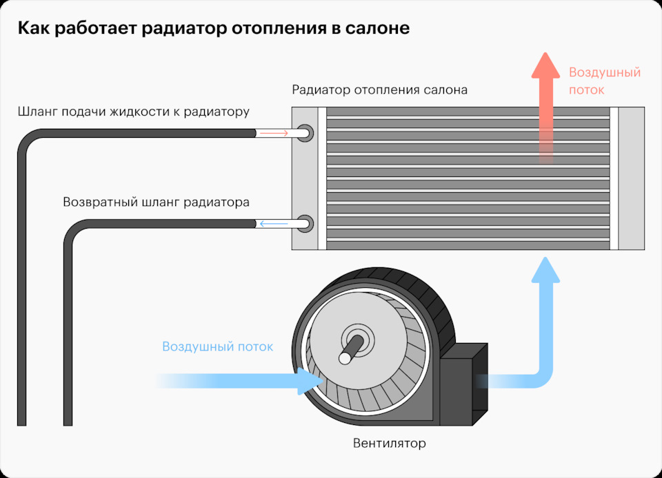 Когда двигатель нагревается, происходит теплообмен. Антифриз охлаждает двигатель, забирая от него тепло, и горячий антифриз поступает в радиатор печки. В это время вентилятор печки прогоняет через радиатор холодный воздух. Таким образом, происходит теплообмен: радиатор отдает тепло воздуху, а воздух охлаждает радиатор. Теплый воздух поступает в салон, а охлажденный тосол возвращается в двигатель и охлаждает его. Данная система отопления является наиболее распространенной и эффективной.