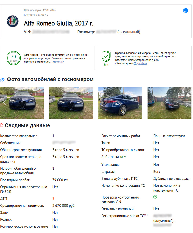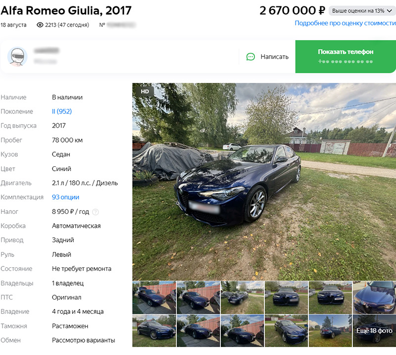Отчасти в этом поможет проверка авто через специальные сервисы. Она покажет биографию машины и поможет понять, стоит ли вообще с ней связываться. Вот пример: Alfa Romeo Giulia – цена «в рынке», год-пробег не критические.