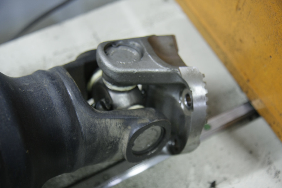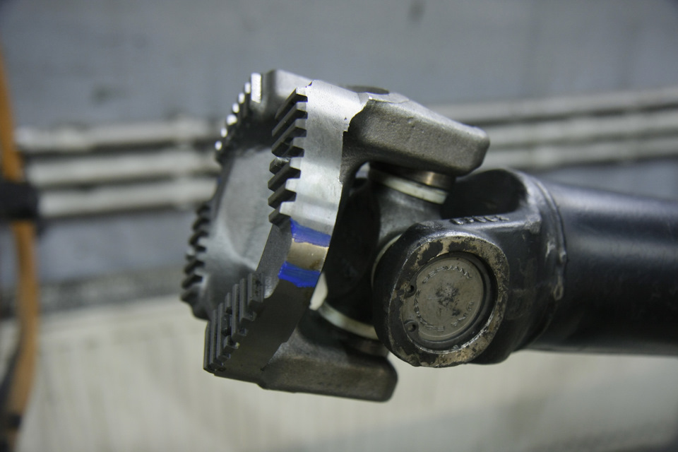 Что они ещё пытались делать… Так как чашки свободно болтались в проушинах, они их обточили болгаркой и зафиксировали стопорным кольцом. Это… даже не знаю как назвать. Смекалка, конечно. Но не работает. Никакое кольцо при этих нагрузках не выдержит. При наборе скорости и при торможении карданные валы испытывают изгибающие напряжения, которые просто выдавливают плохо запрессованные чашки крестовин. Дальше люфт и ремонт.