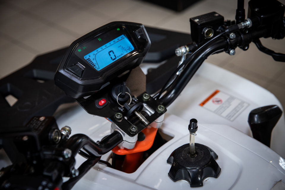 Руль имеет диаметр 22 мм. С правой стороны расположена машинка передних тормозов и регулируемый курок газа. Слева находится машинка заднего тормоза и пульт управления электрикой. По центру замок зажигания. Передачи дублируются на панели приборов.