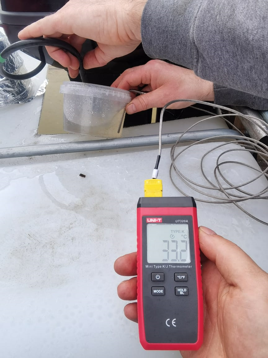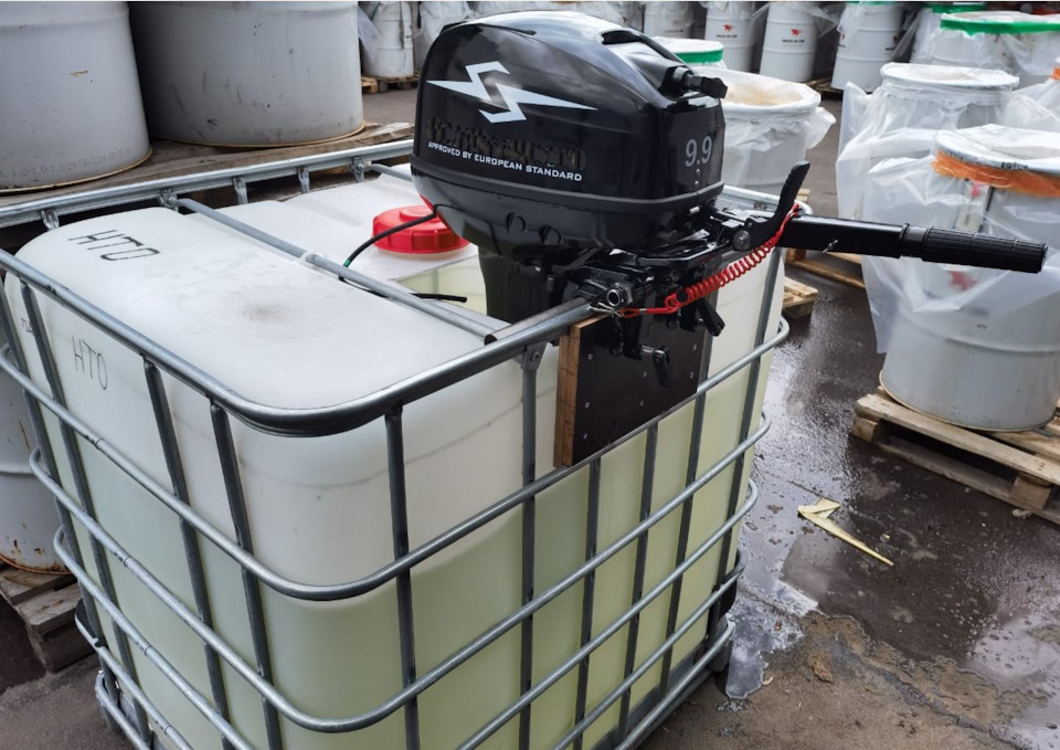 Третьей проблемой оказался перегрев. Как известно, лодочный мотор для охлаждения берет воду из водоема и сбрасывает ее обратно уже горячей. На открытой воде это не проблема, но в замкнутом объеме вода все время нагревается. Уже через пять часов работы температура воды в кубе достигла +33°C. А гонять мотор мы планируем по несколько суток. Представляете как нагреется куб.