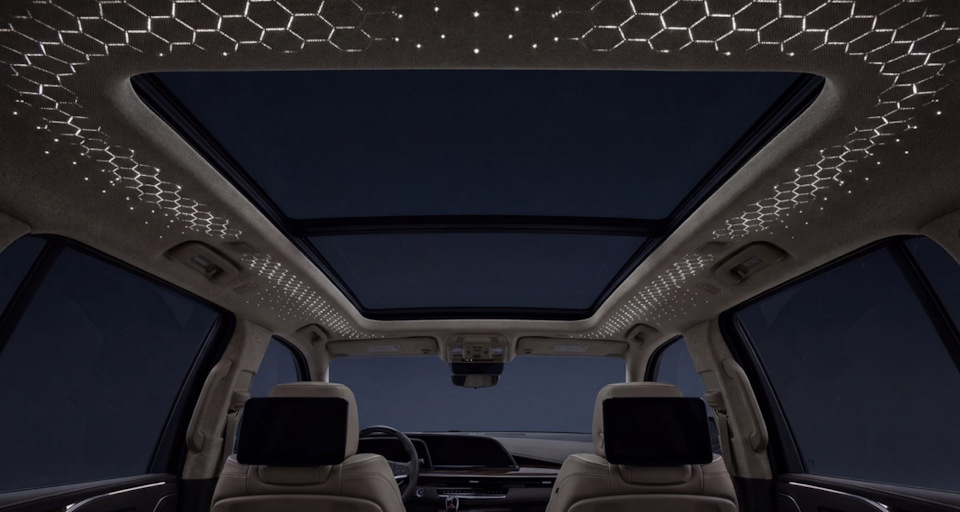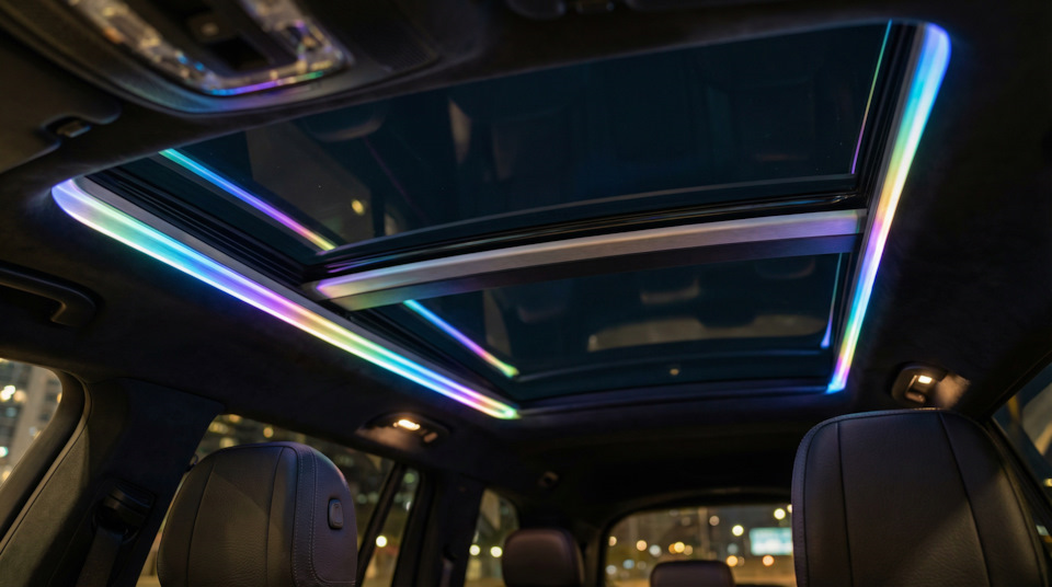 Для больших внедорожников и минивэнов (Класс E/F) — BMW X7, Mercedes GLS, Range Rover, V-Class — перетяжка стоит 60-150 тысяч рублей. Огромная площадь потолка (до 5 м²) превращается в гигантский космический купол. Здесь можно развернуться: 12 000 звезд, созвездия, Млечный путь — полноценная галактика над тремя рядами сидений.
