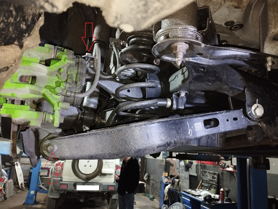 Откручиваем крепление поперечного рычага к ступице и крепление тормозного шланга