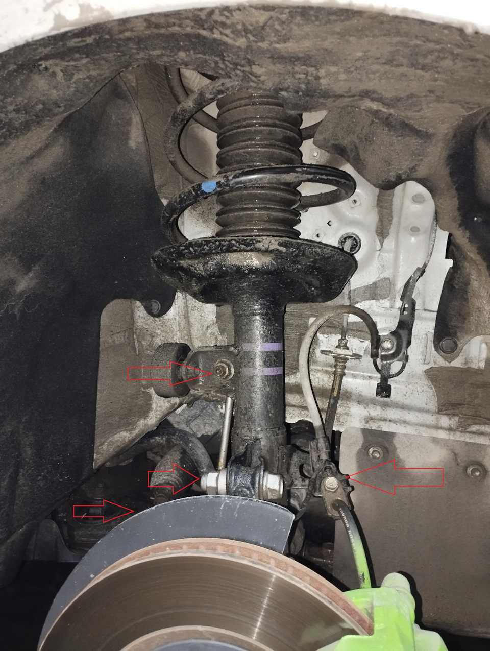 Откручиваем нижнее крепление стойки амортизатора к ступице, верхнее крепление стойки стабилизатора и крепление тормозного шланга