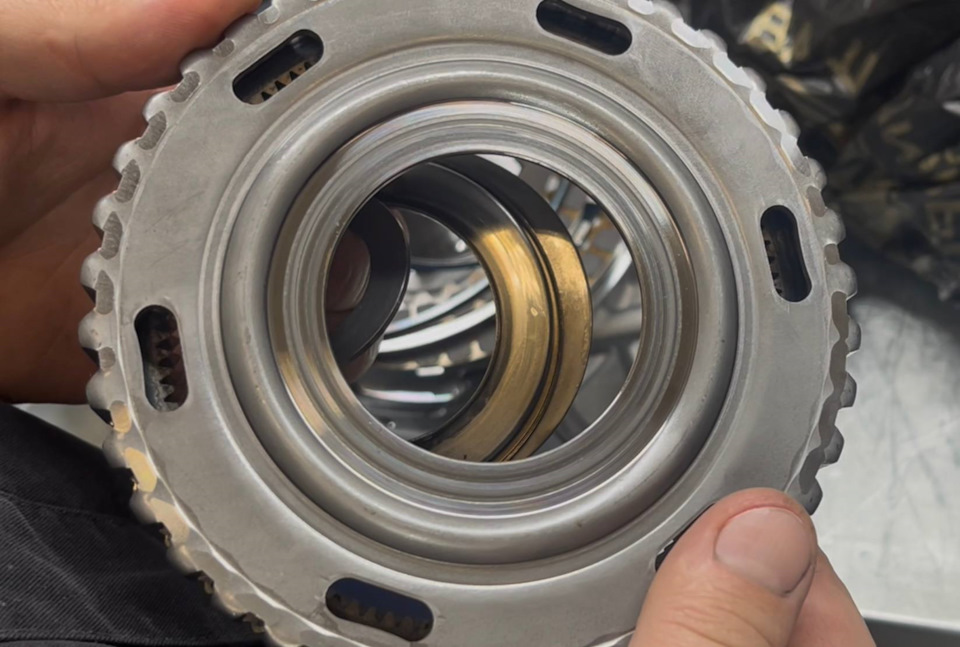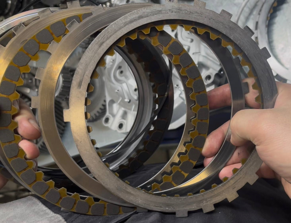 Остальные фрикционные пакеты в разной степени усталости, фрикционы местами осыпались, на стальных дисках отчётливо заметны следы износа и перегрева: