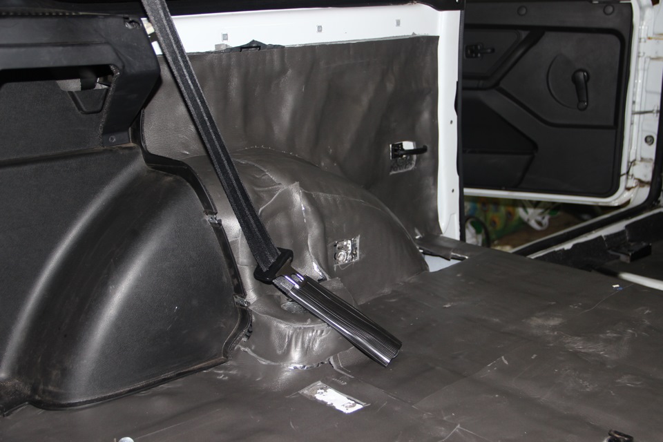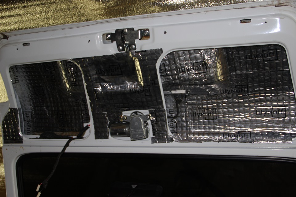 Двери, крылья и задняя дверь проклеены вибродемпфирующим материалом Шумофф М3. Поверх уложен шумотеплоизоляционный материал Шумофф П4.
