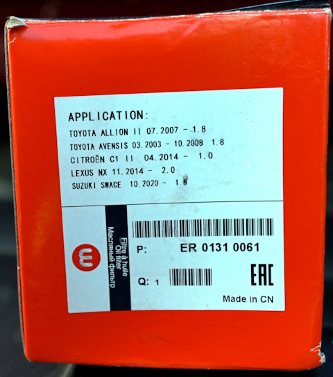 - Фильтр масляный TOYOTA Corolla 2007-, TOYOTA RAV 4 2013-, TOYOTA Corolla Fielder 2001-, TOYOTA Avensis 2003-, GEELY MK Cross 2006