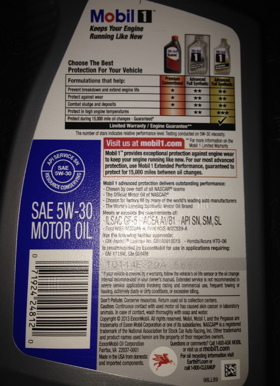 МАСЛО МОТОРНОЕ ВСЕСЕЗОННОЕ MOBIL 1: SAE 5W-30, СОД. НЕ В КАЧЕСТВЕ ОСНОВНЫХ КОМПОНЕНТОВ 3 МАС.% НЕ
