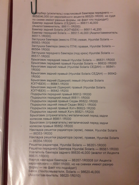 Перечень оригинальных артикулов запчастей для Hyundai Solaris