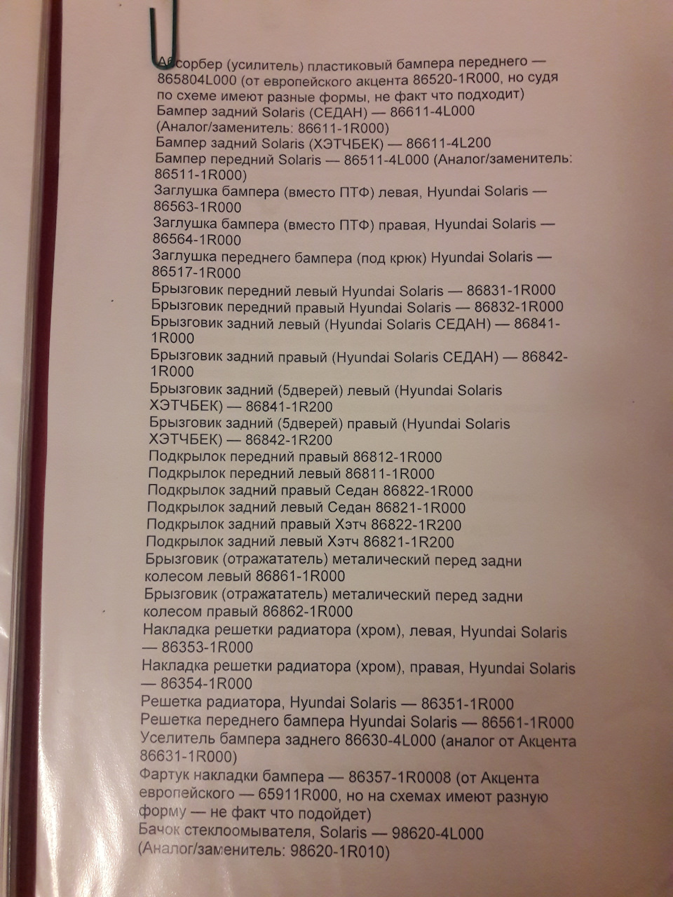 Артикулы запчастей на Solaris.3 Обновлено 05.01.19 г.