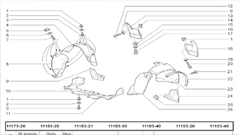 Щитки и кожухи крыльев (подкрылки). Защита картера (алюминька). Брызговики двигателя Гранта на Калину 1