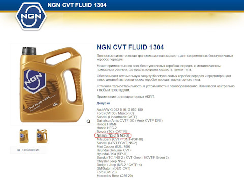 - Nissan CVT NS-2, жидкость для вариатора (4л.)
