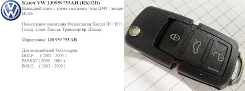 1J0959753AH Пульт с ключом и чипом VW PASSAT 2002-2005