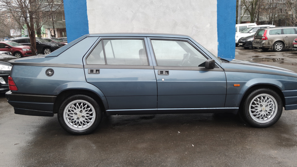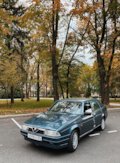 Идеальная Альфа Ромео 75 цвета моря, с аутентичным белым салоном, горизонтальными карбюраторами и духом тех самых времён. Родной пробег — чуть меньше 110 тысяч.