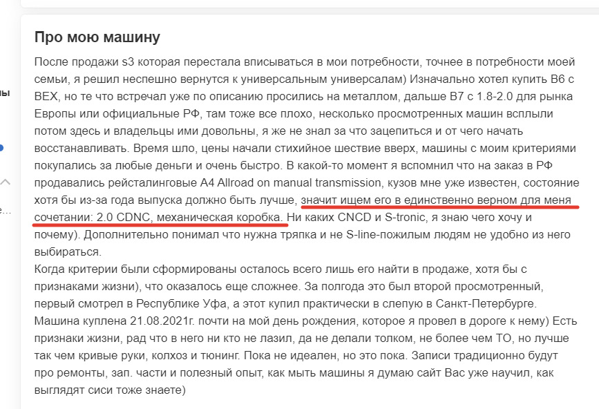 После продажи s3 которая перестала вписываться в мои потребности, точнее в потребности моей семьи, я решил неспешно вернутся к универсальным универсалам) Изначально хотел купить B6 c BEX, но те что встречал уже по описанию просились на металлом, дальше B7 с 1.8-2.0 для рынка Европы или официальные РФ, там тоже все плохо, несколько просмотренных машин всплыли потом здесь и владельцы ими довольны, я же не знал за что зацепиться и от чего начать восстанавливать. Время шло, цены начали стихийное шествие вверх, машины с моим критериями покупались за любые деньги и очень быстро. В какой-то момент я вспомнил что на заказ в РФ продавались рейсталинговые A4 Allroad on manual transmission, кузов мне уже известен, состояние хотя бы из-за года выпуска должно быть лучше, значит ищем его в единственно верном для меня сочетании: 2.0 CDNC, механическая коробка. Ни каких CNCD и S-tronic, я знаю чего хочу и почему). Дополнительно понимал что нужна тряпка и не S-line-пожилым людям не удобно из него выбираться.