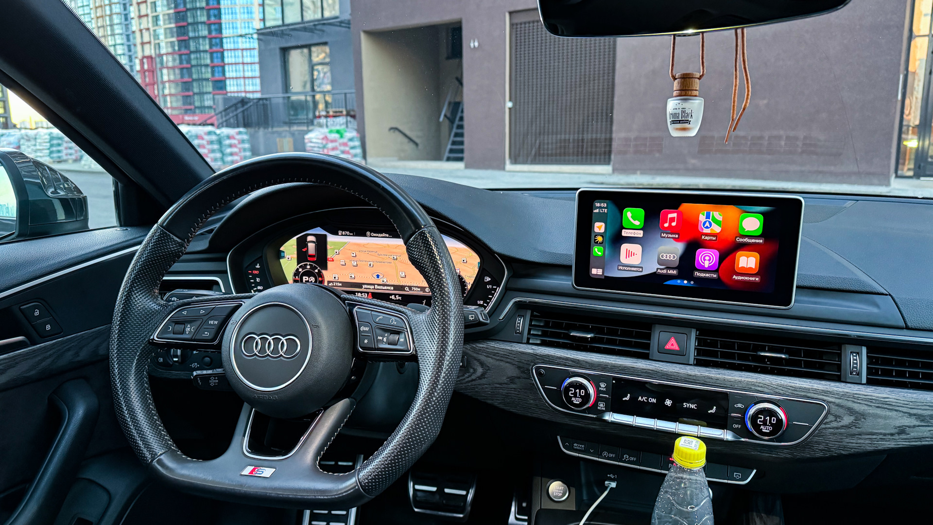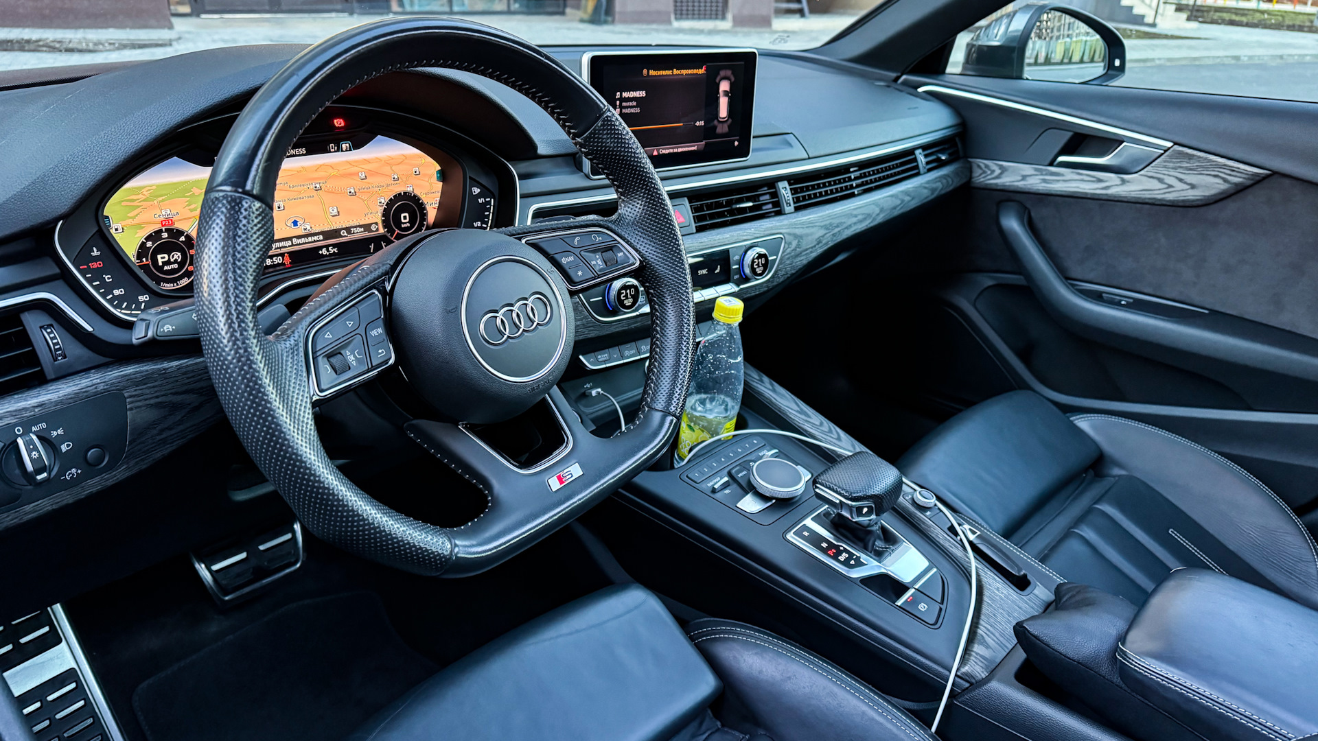 Панорама, черный салон, Audi Virtual Cockpit, лепестки на руле, спортивные сиденья с регулируемой поясничной подушкой, круиз-контроль адаптивный с радарами, контроль полос, режим движения в пробке, авто дальний, трёхзонный климат-контроль, подогрев зеркал, система старт/стоп, выбор режимов вождения (drive select), система складывающихся задних сидений, светодиодные задние фонари с динамическими поворотниками, навигационная система с картами, LED фары, Apple Carplay/Android Auto, AUX, датчик дождя и света, парктроники перед и зад, сабвуфер, индикатор давления шин, 18-е диски, электропривод багажника.