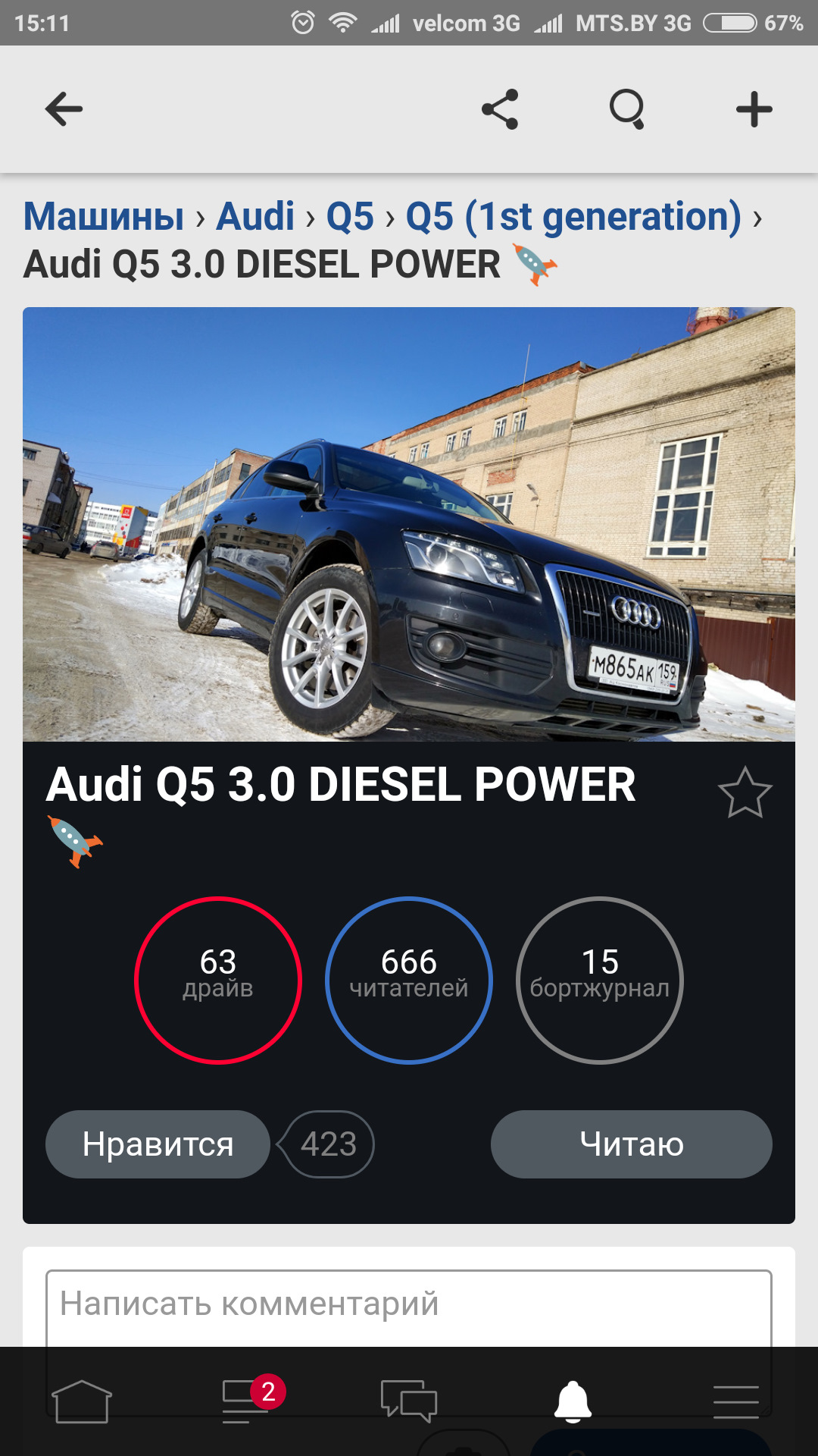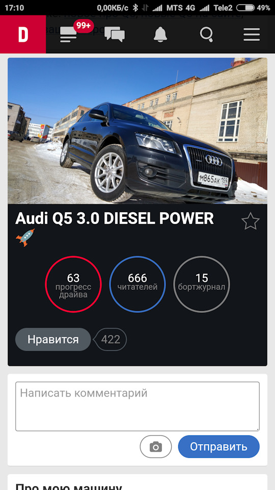 После продажи Audi A6 Allroad какое-то время ездил на Skoda Octavia A7. Что могу сказать, хорошая машина. Огромный багажник и салон, отличный двигатель 1.4. TSI 140 ЛС. Динамики авто более чем достаточно, но с приходом зимы отсутствие полного привода вгоняло в тоску. Особенно на снежной дороге. Было решено продать Skod'y и искать Туарег или Q7. Прокатившись на Туареге, понял, что это не мое. Хорошие Q7 были выше отведенного бюджета и совершенно случайно нашел в 3-х литровую, дизельную Q5. До этого больше смотрел в сторону 2.0 TFSI, хоть и знал о всех бедах проблемах мотора CDNC.