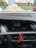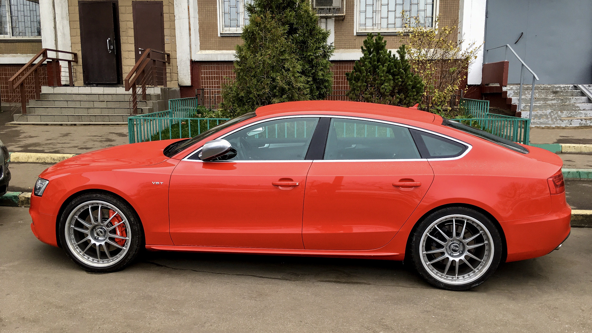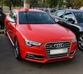 Ауди S5. Снаружи красная. Внутри чёрная. Кваттро. 5 дверей. 3 литра с механическим нагнетателем. 2 педали. Скошенный руль. Лепестки. Есть даже радио и колонок штук 10.
