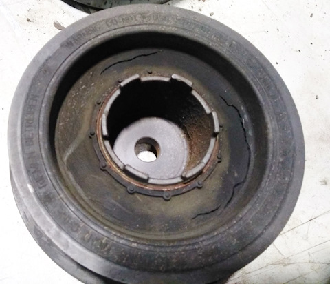 При замене масла решил глянуть как там ремень и ролики, и заметил внутри шкивы коленвала мусор, присмотревшись оказалось, демпферу хана, он весь в трещина…