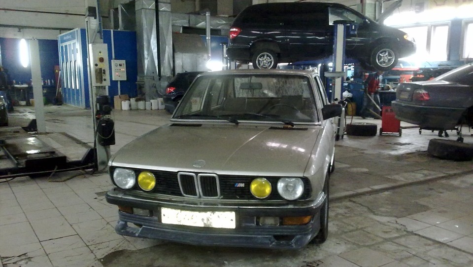 В общем это олдовая бмв е28 модификации 525е (мотор м20b27) с коробкой Getrag 260 что не может не радовать. Вообще конечно машина немного ржавенькая и вся подвеска у неё убитая и много других проблем. Куплена мной была не просто-так, смотрел несколько вариантов на протяжении долго периода времени. Но все были битые. Эта машина вроде сильных аварий вообще не видела и вся ровная (перед видно, зад разбирал перед покупкой) Только железные фартуки спереди и сзади замяты.