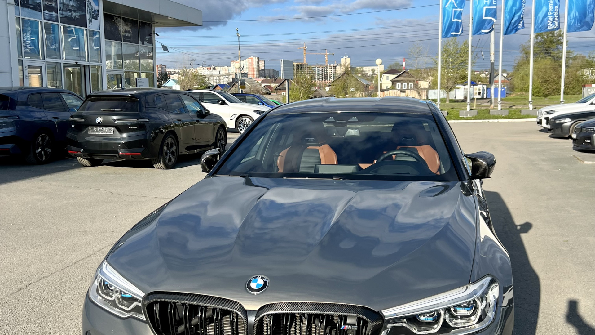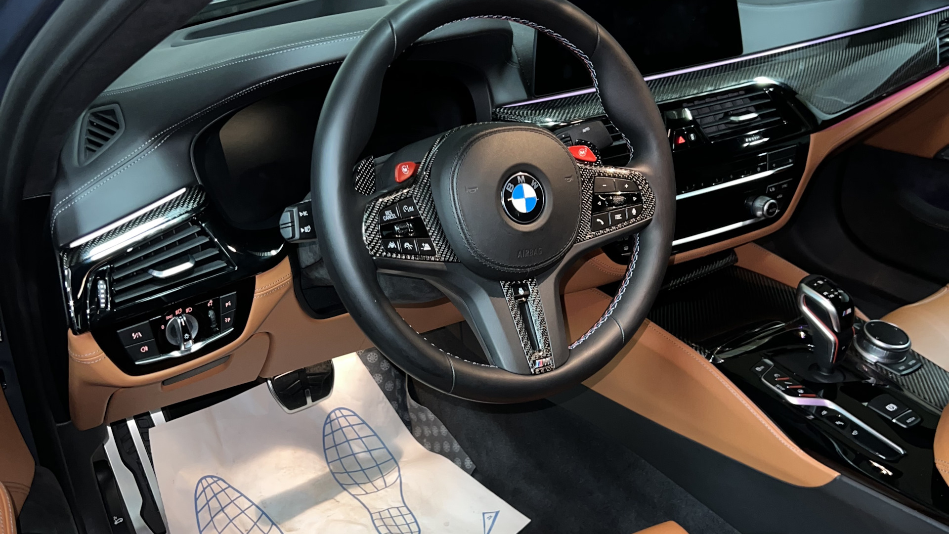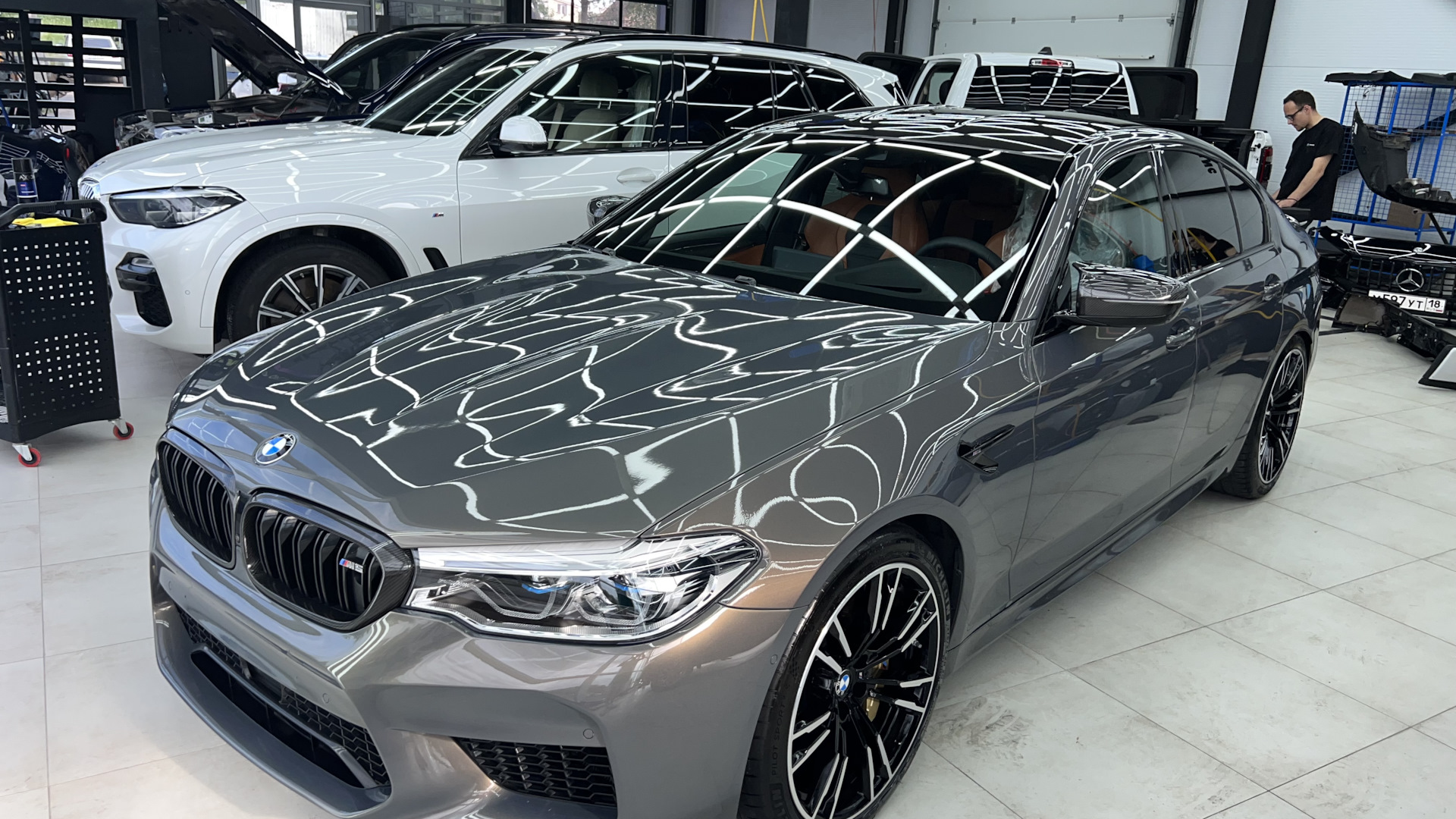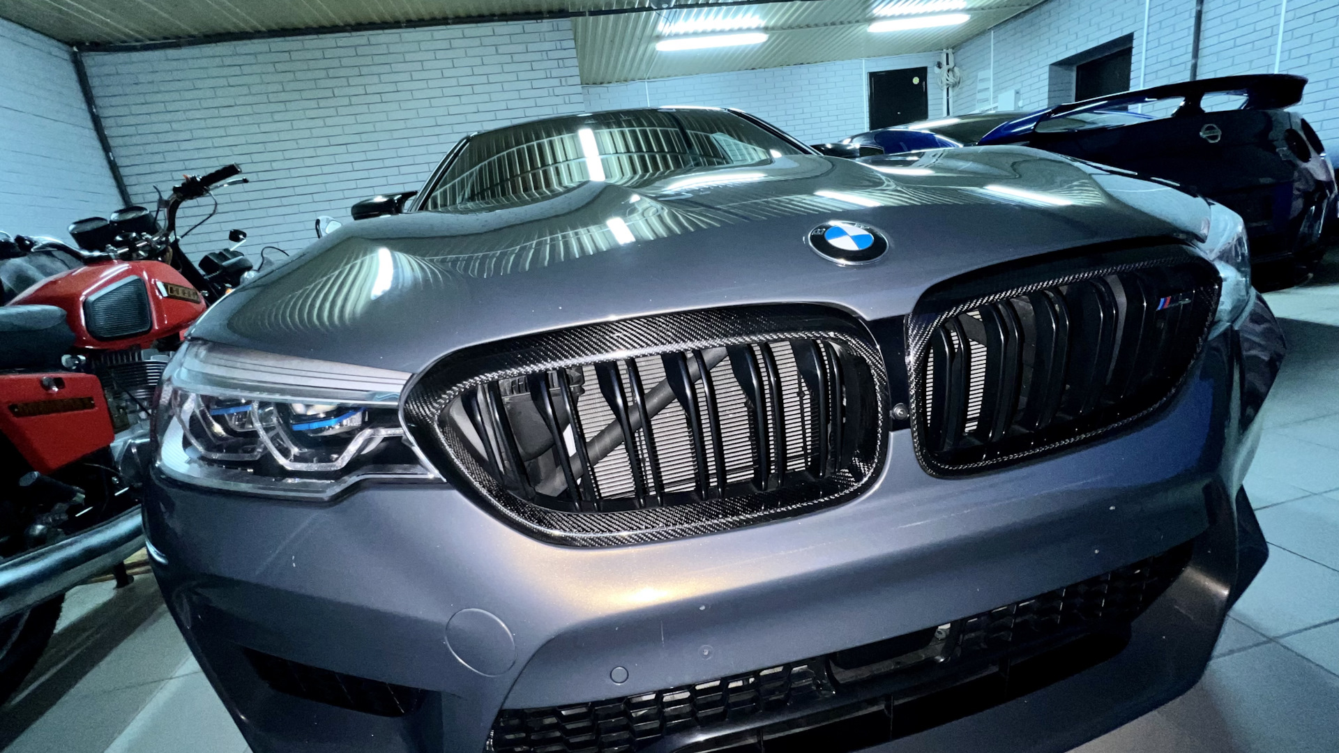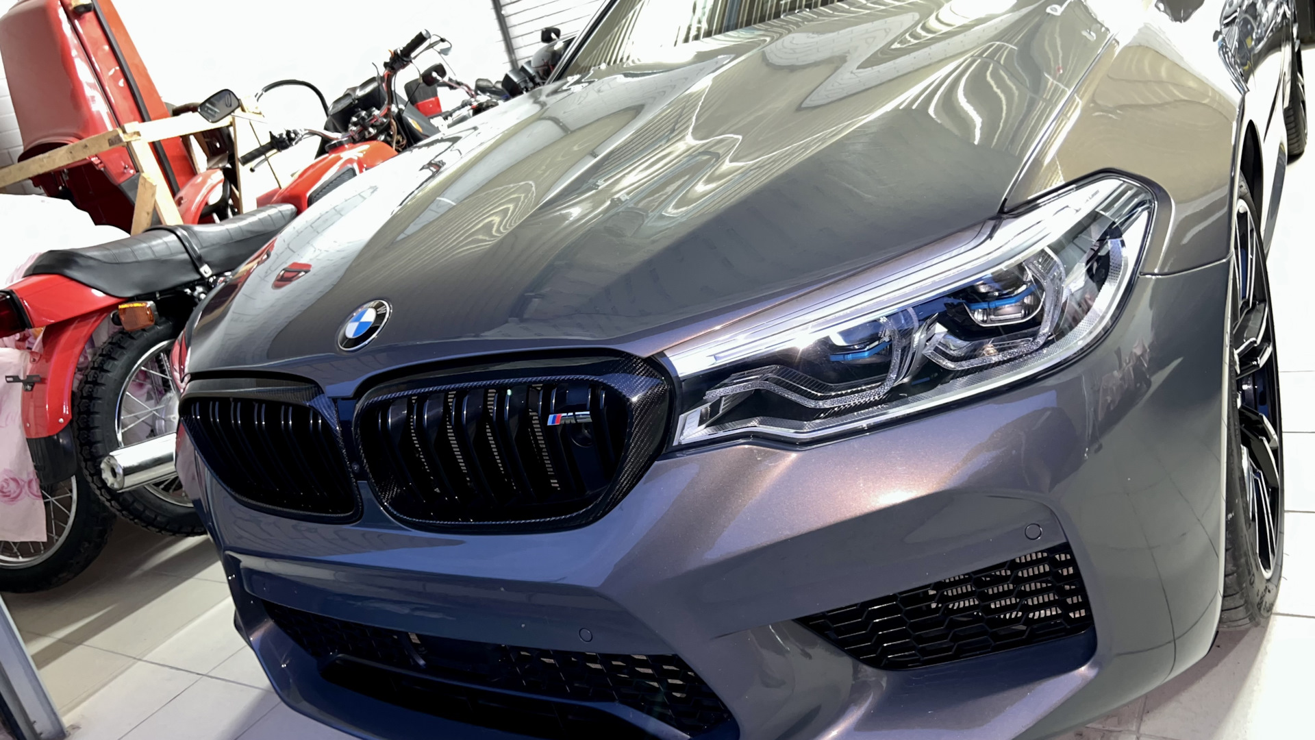 Заводская M5 competition. Карбон-керамическая тормозная система, максимальные кресла с кучей регулировок, массаж передних сидений, лазерная оптика, "Night Vision" с распознаванием людей, активная защита пешеходов, активный круиз с автопилотом, солнце защитное остекление, карбон кожух двс, альканатара потолок и стойки потолка, карбоновая крыша и другие элементы внешней и внутренней отделки, а так же многое-многое другое. Классная фишка в виде выезжающего фаркопа, его кстати ещё похоже и не использовали даже. Не смотря на это, автоматическое открывание двери багажника работает с жеста. В конфигураторе указано, что опознавательные шильды м5 competition на крышку багажника не устанавливались. Обязательно разок прокатим в упряжке м5 один из наших мотоциклов времён СССР🤝