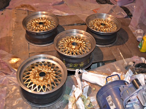 диски покрасил в золотой, полку слегка полирнул . сзади резина слегка чиркает об арку, спереди еще большое расстояние до арки. клиренс на данный момент 7см.
