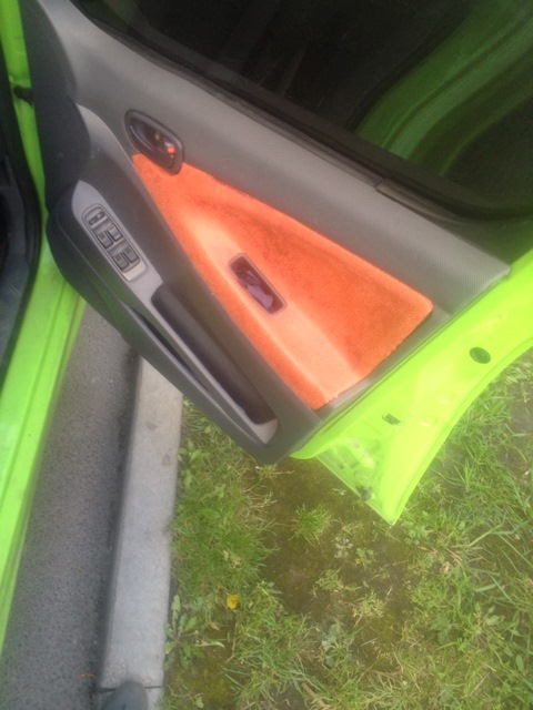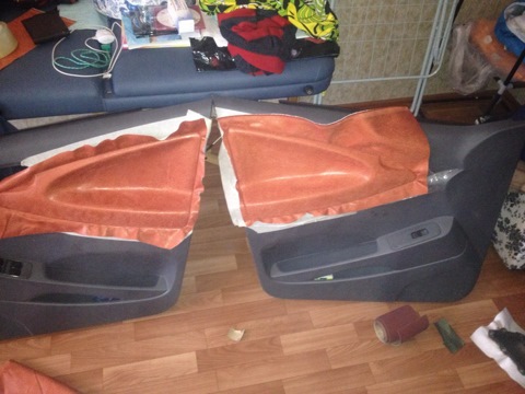 Устал я от ткани на двери вечно руку натирала :( и вот на выходном решился поэкспериментировать. Взял кожу у бабушки и пошел снимать пластик с дверей. По моему на первый раз сделал неплохо)