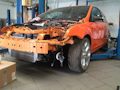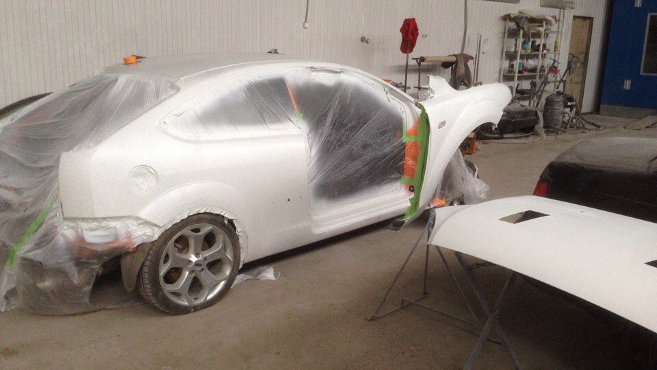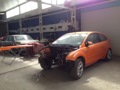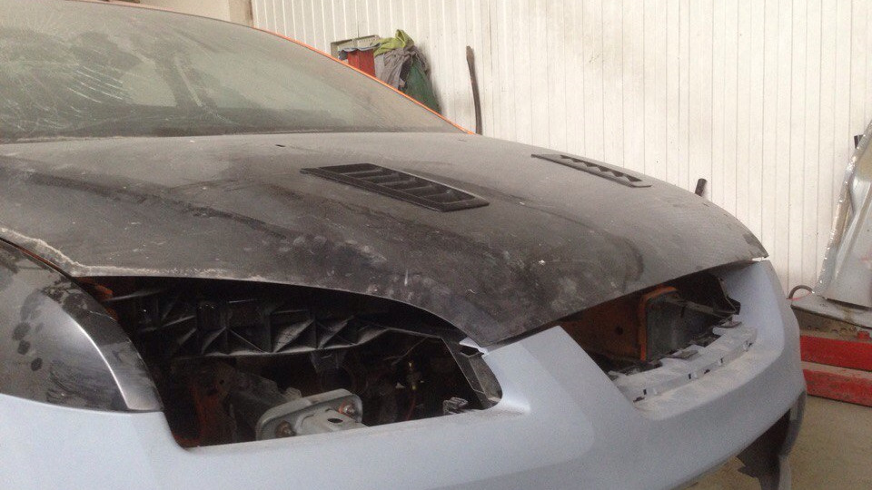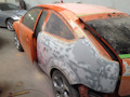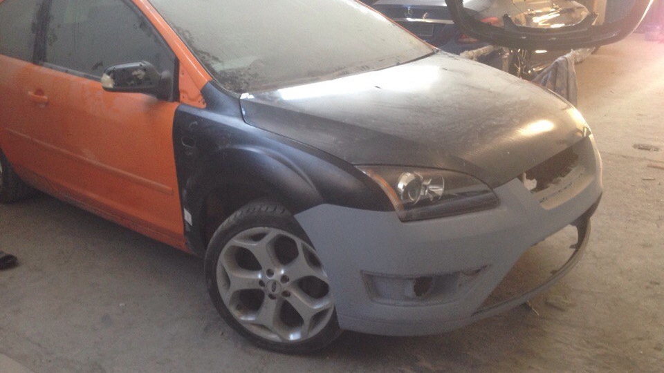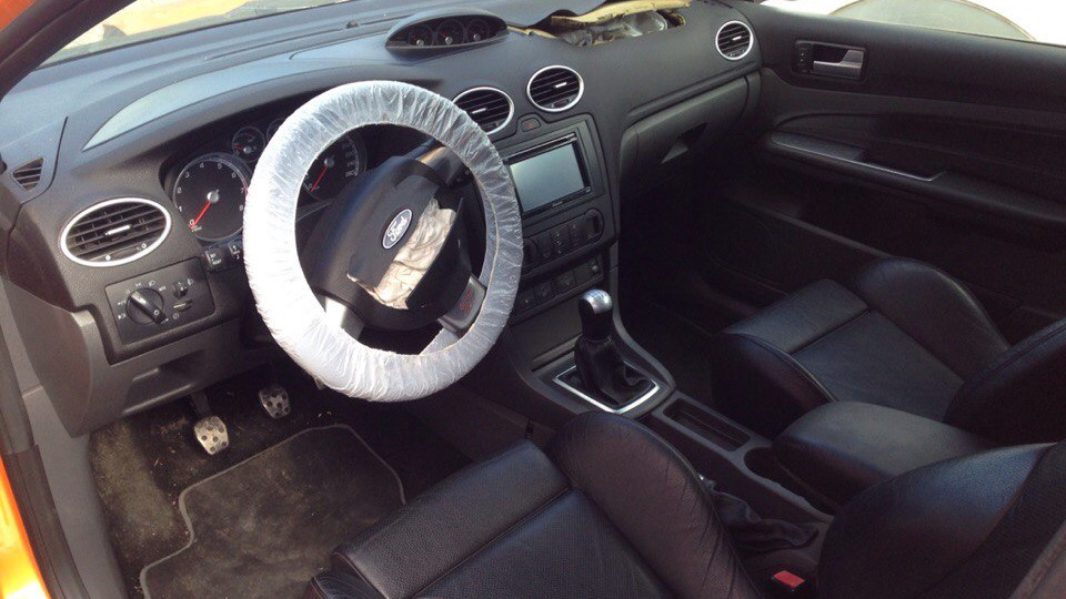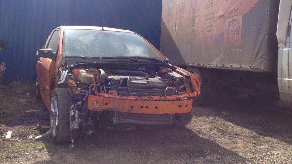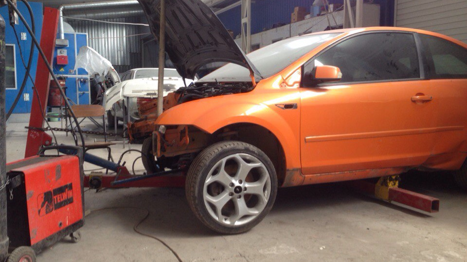 Начнем с вопроса, зачем я его купил, притом битый? Был у нас в семье не так давно мондео 2,5 220 лошадок, тот же мотор, та же коробка. Я в него просто влюбился, но это был Mondeo 4, а хотелось компактную зажигалку. Денег особо не было, но есть хорошие подвязки с рихтовщиком, маляром и слесарями, т.к. ранее работал на многопрофильном СТО, работал как с клиентами на сервисе, в лице управляющего, работал с запчастями в лице специалиста отдела запасных частей… поэтому знал все тонкости ремонтных работ, да и часто к тому же покупали битые автомобили и давали им вторую жизнь, поэтому есть закрепленная вкладка в дром.ру, где отображаются только битые машины. И вот настал день, открываю, смотрю, оранжевый, фокус СТ… и цена… в груди екнуло, это было перед выходными, 2 дня нормально не спал, 100 раз пересмотрел выложенные фотки, созвонился с хозяином, он обрисовал примерно, что за ДТП, что повреждено. На фото как обычно выглядело все получше, машинка 2006 года, 3-х дверное купе, салон кожа Recaro, датчик света, дождя, зеркало с автозатемнением, стекло с подогревом (было, сейчас разбито), головное устройство Pioneer, подогрев передних сидений, покупалась в Туле, 3 года ездила там, после приехала в Армавир и все это время была на Кубани. Предыдущий хозяин купил ее в конце 2014 года, и в первый же день попал в ДТП, машина простояла больше года пока шли прения со страховой компанией и сейчас после положительного решения о возмещении убытка он ее выставил на продажу. Что порадовало, машина до этого в ДТП не была, кузов весь ровный, шпатлевки нет, есть конечно сколы по кузову, но не критично, принято решение машину полностью освежить. Патрубки турбины все сухие, мотор после вскрытия оказался на удивление в идеале, по свечам горение смеси идеальное, следов масложора нет. Автомобиль на данный момент имеет повреждение передней части, и левого карниза. Мотор и КПП целые, сломаны кронштейны и опоры крепления ДВС, КПП. Стрельнули подушки безопасности передние. Левый лонжерон целый, правый необходимо частично заменить. Левый боковина кузова под замену. По цене сошлись на 200 000 рублей и хозяин забирает музыку (по факту смог забрать только усилитель и сабвуфер, чему я был очень рад, т.к. они занимали половину багажника, меня такой вариант совсем не устраивал).